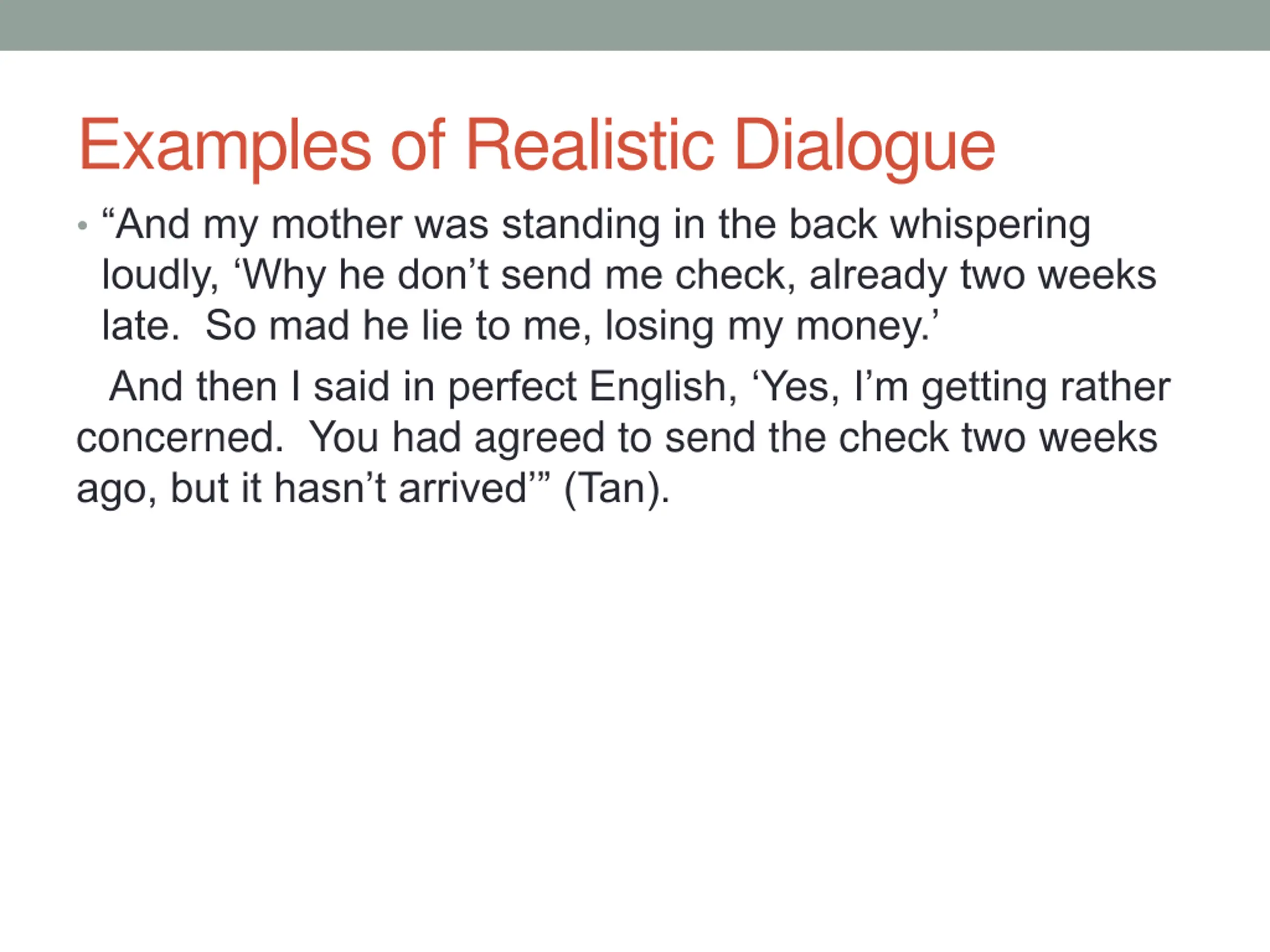 Examples of Realistic Dialogue And my mother was standing in the back whispering loudly, Why he don t send me check, already two weeks late. So mad he lie to me, losing my money. And then I said in perfect English, Yes, I m getting rather concerned. You had agreed to send the check two weeks ago, but it hasn t arrived (Tan).