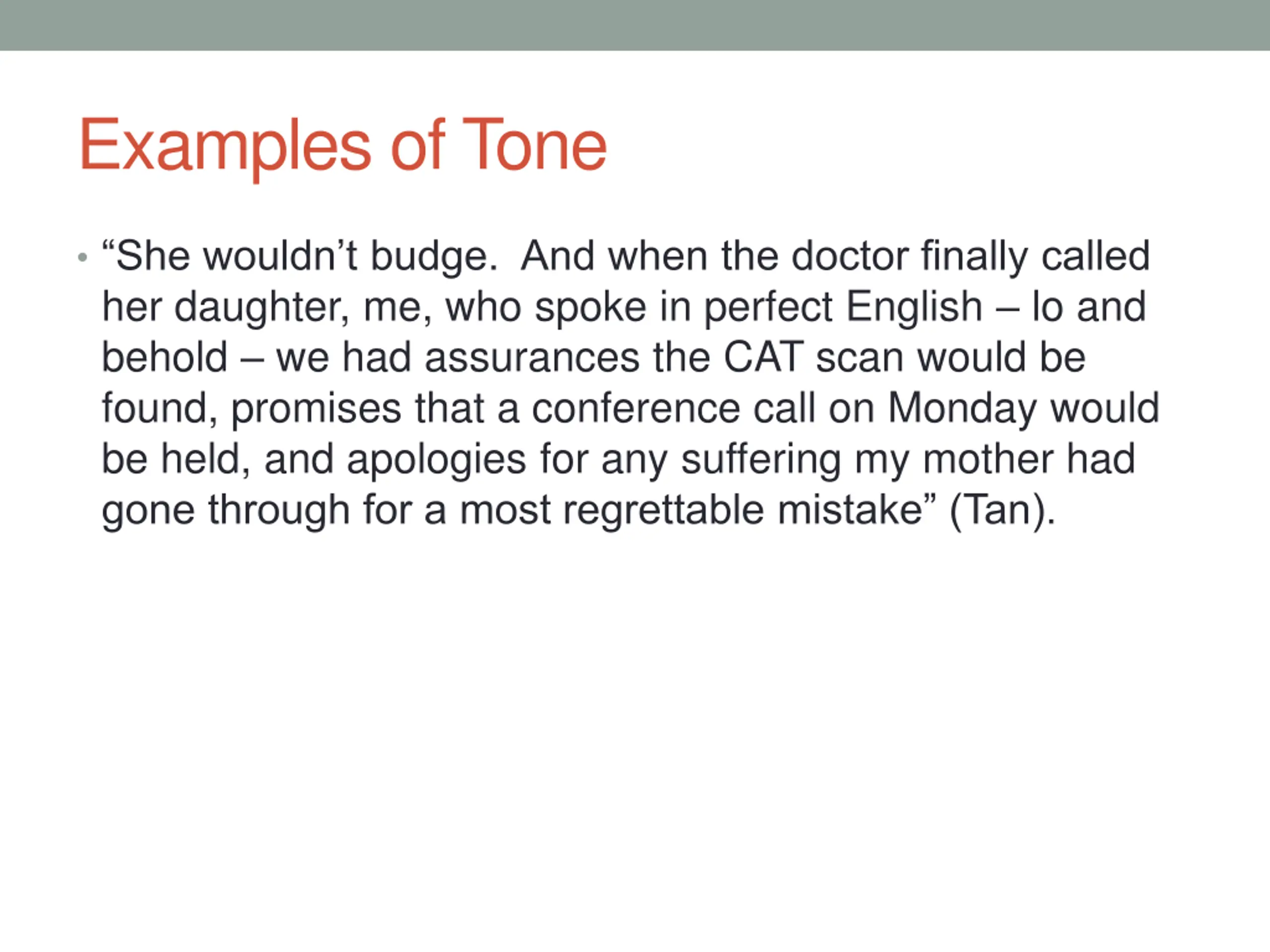 Examples of Tone She wouldn t budge. And when the doctor finally called her daughter, me, who spoke in perfect English lo and behold we had assurances the CAT scan would be found, promises that a conference call on Monday would be held, and apologies for any suffering my mother had gone through for a most regrettable mistake (Tan).