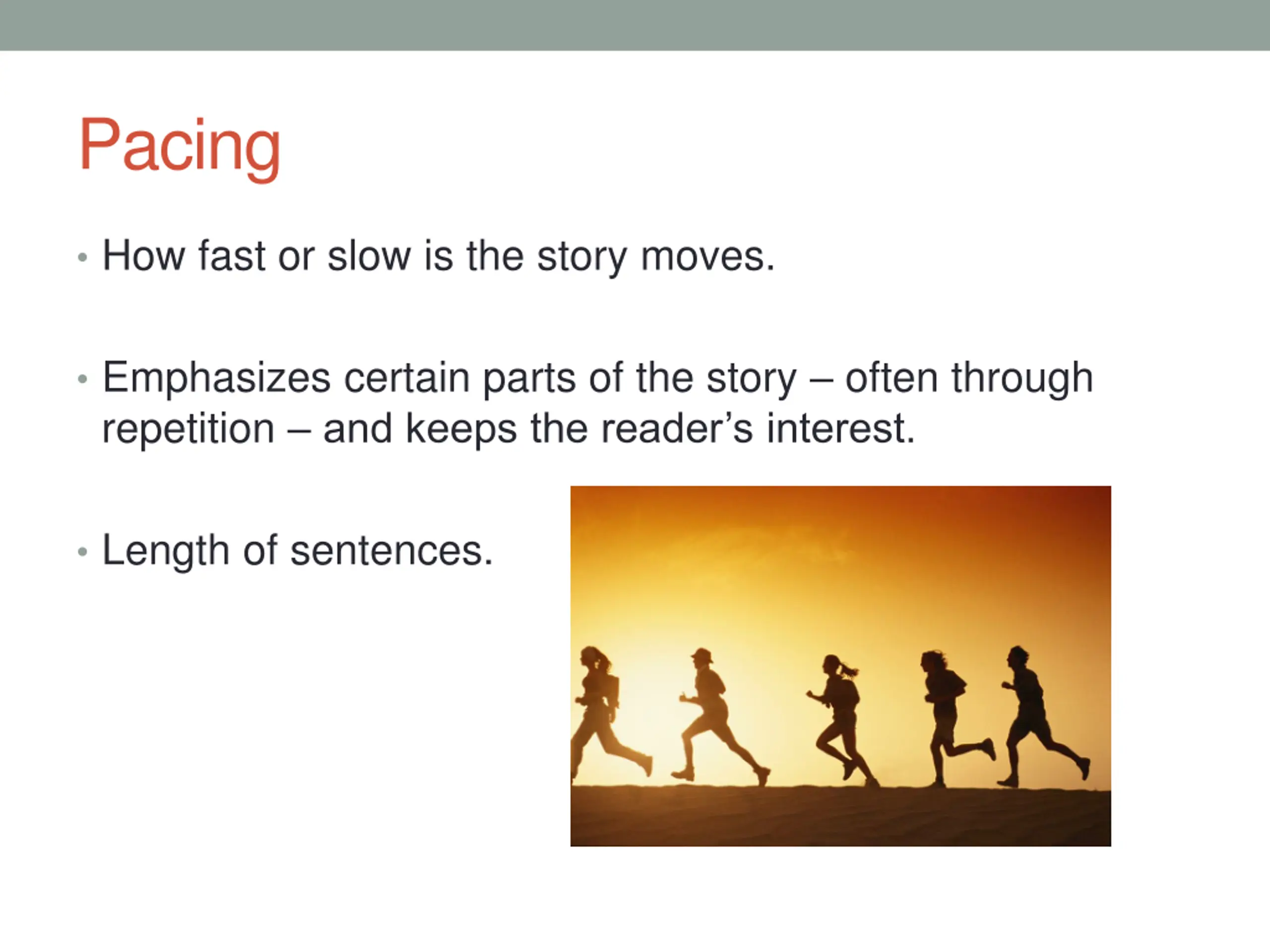 Pacing How fast or slow is the story moves. Emphasizes certain parts of the story often through repetition and keeps the reader s interest. Length of sentences.