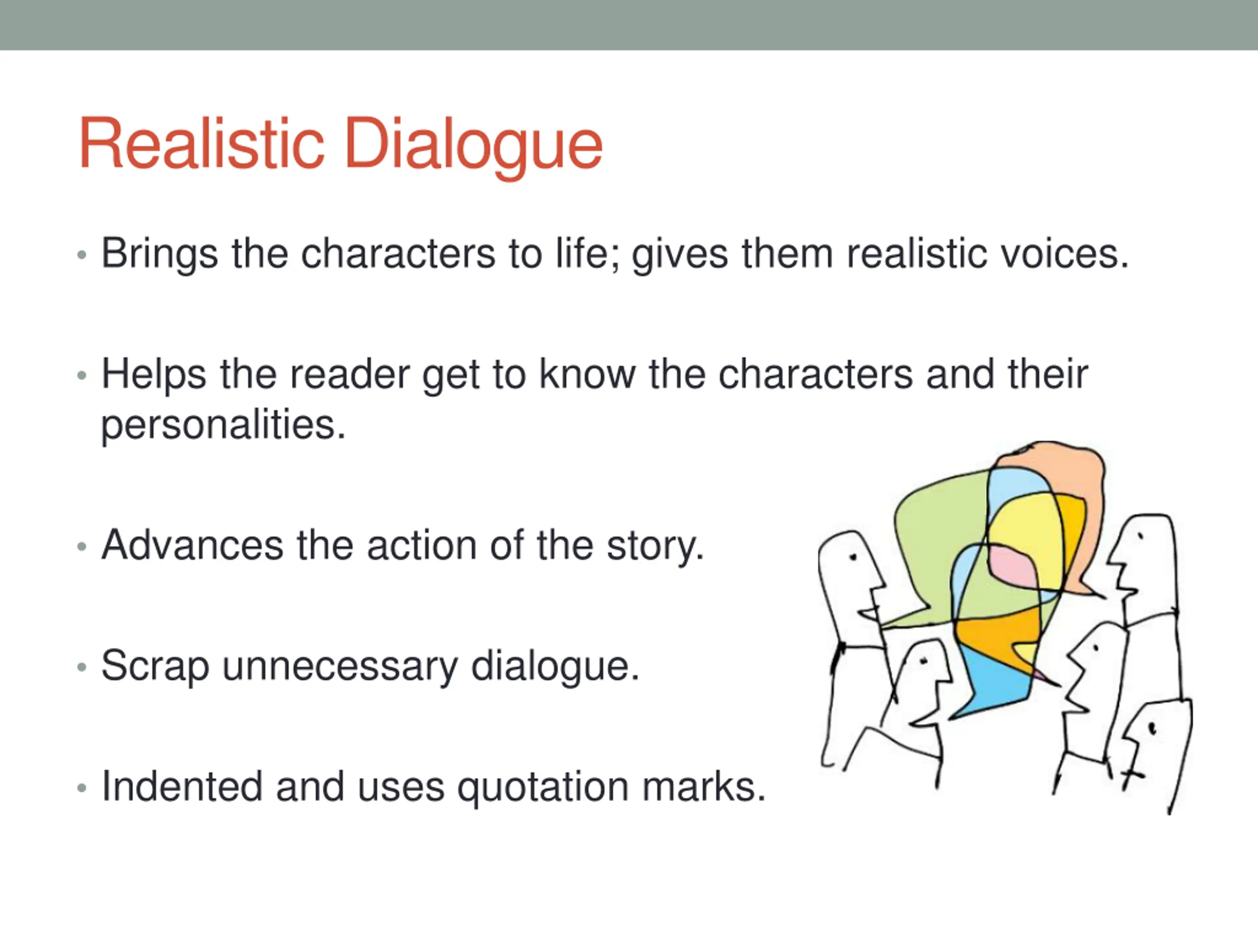 Realistic Dialogue Brings the characters to life; gives them realistic voices. Helps the reader get to know the characters and their personalities. Advances the action of the story. Scrap unnecessary dialogue. Indented and uses quotation marks.