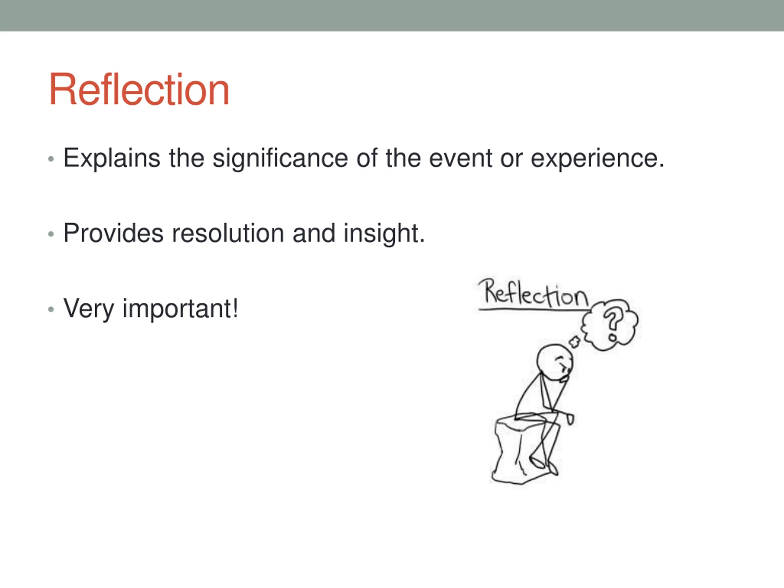 Reflection Explains the significance of the event or experience. Provides resolution and insight. https://kellyannparrydotcom.files.wordpress.com/2013/08/reflection.jpg?w=300h=214 Very important!