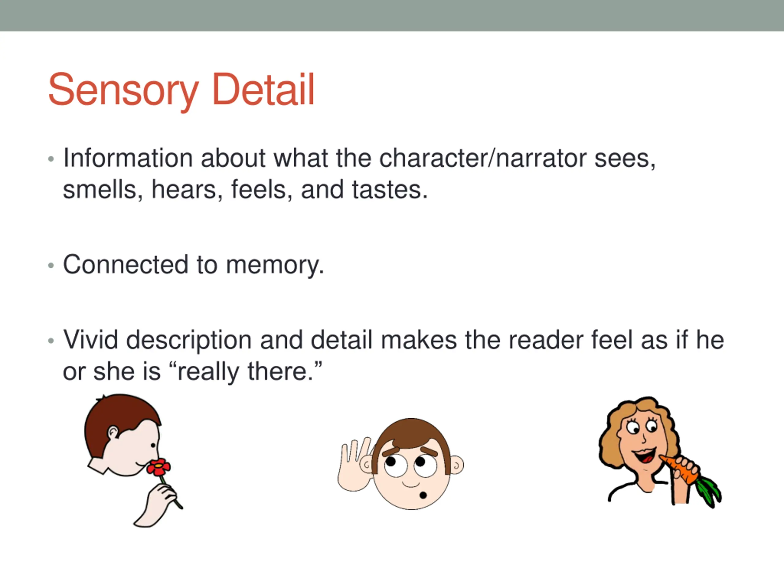 Sensory Detail Information about what the character/narrator sees, smells, hears, feels, and tastes. Connected to memory. Vivid description and detail makes the reader feel as if he or she is really there.