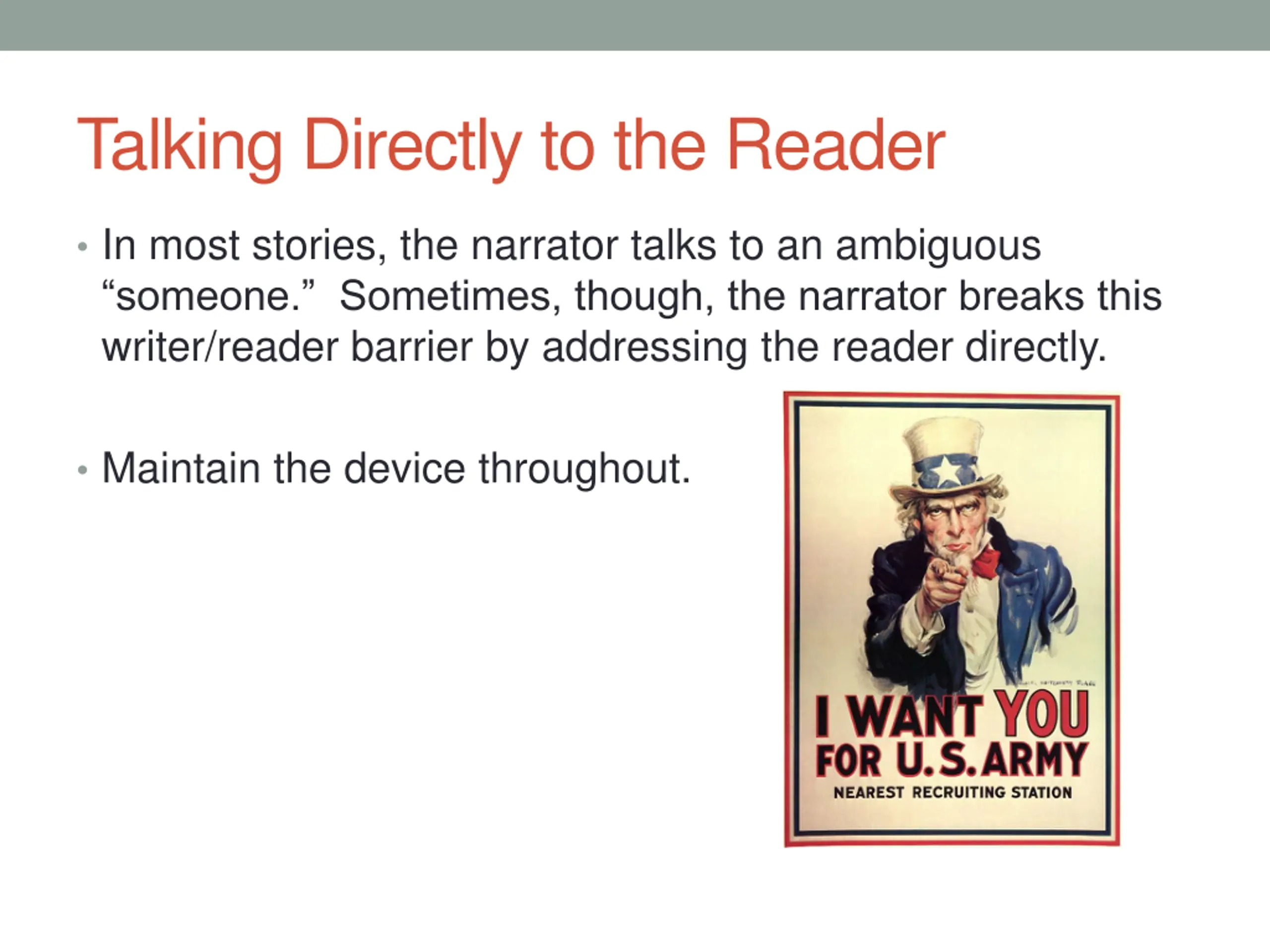 Talking Directly to the Reader In most stories, the narrator talks to an ambiguous someone. Sometimes, though, the narrator breaks this writer/reader barrier by addressing the reader directly. Maintain the device throughout.