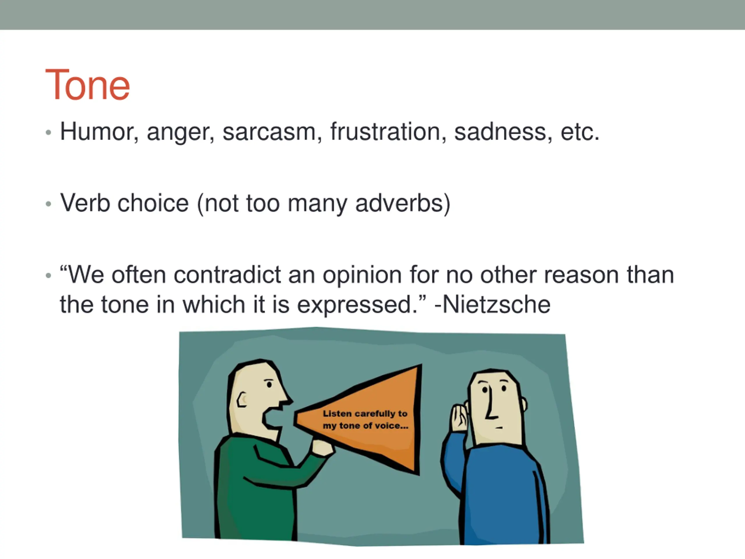 Tone Humor, anger, sarcasm, frustration, sadness, etc. Verb choice (not too many adverbs) We often contradict an opinion for no other reason than the tone in which it is expressed. -Nietzsche