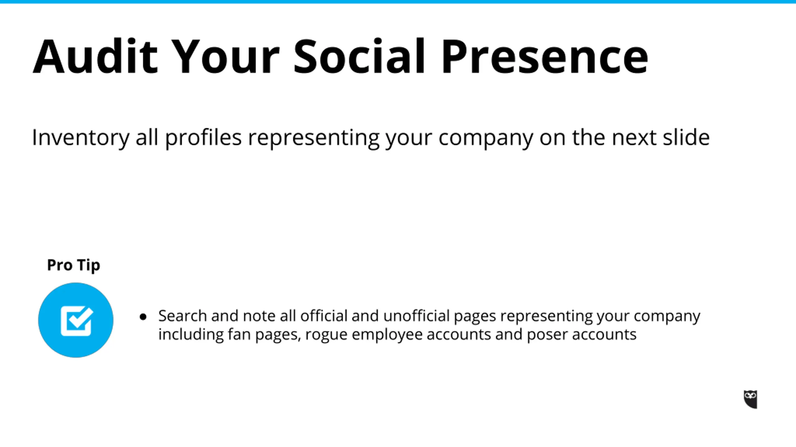 Audit Your Social Presence Inventory all profiles representing your company on the next slide Pro Tip Search and note all official and unofficial pages representing your company including fan pages, rogue employee accounts and poser accounts