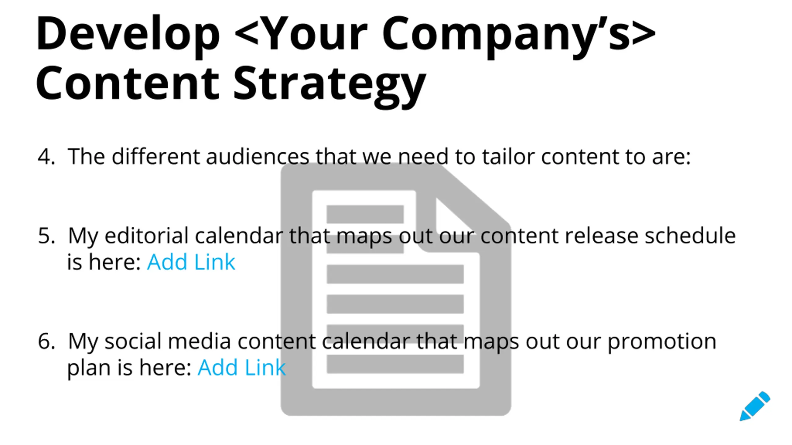 Develop <Your Companys> Content Strategy 4. The different audiences that we need to tailor content to are: 5. My editorial calendar that maps out our content release schedule is here: Add Link 6. My social media content calendar that maps out our promotion plan is here: Add Link