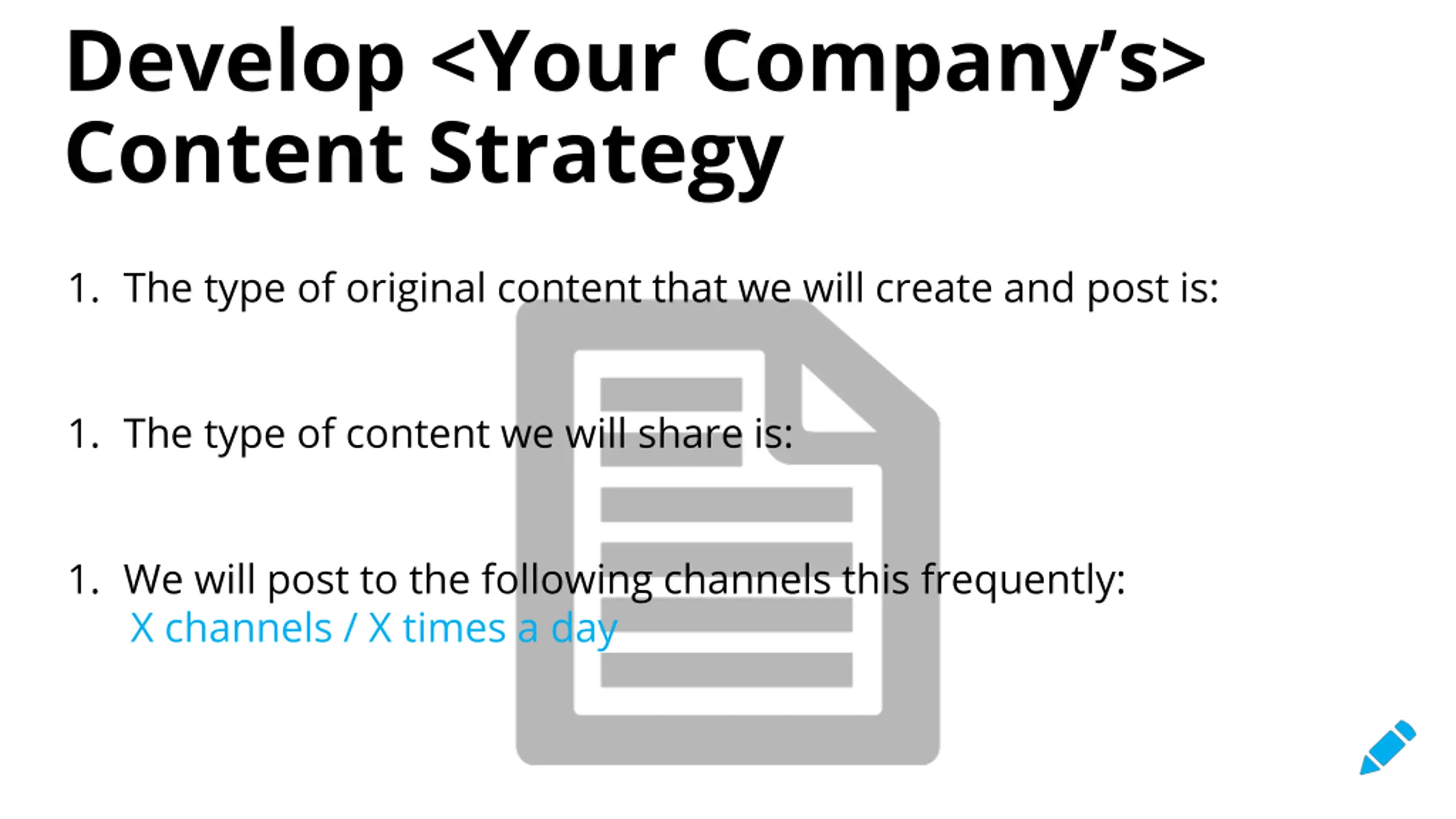 Develop <Your Companys> Content Strategy 1. The type of original content that we will create and post is: 1. The type of content we will share is: 1. We will post to the following channels this frequently: X channels / X times a day