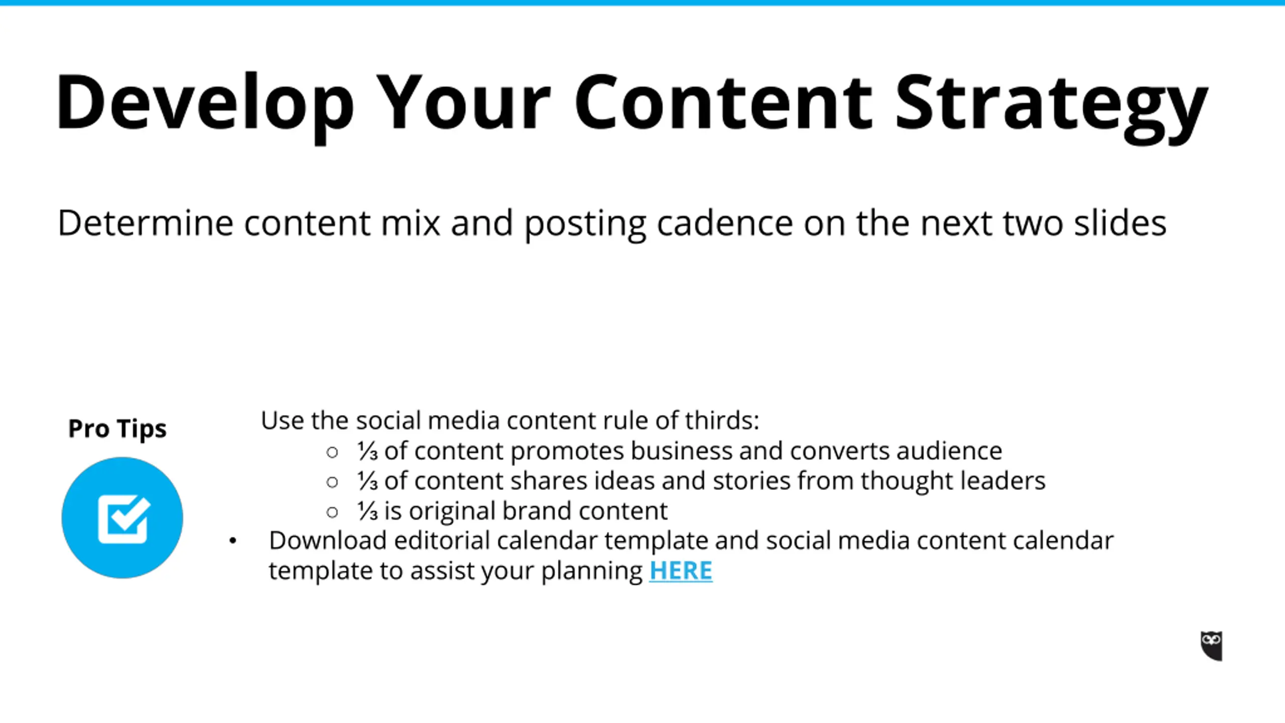 Develop Your Content Strategy Determine content mix and posting cadence on the next two slides Use the social media content rule of thirds: of content promotes business and converts audience of content shares ideas and stories from thought leaders is original brand content Download editorial calendar template and social media content calendar template to assist your planning HERE Pro Tips