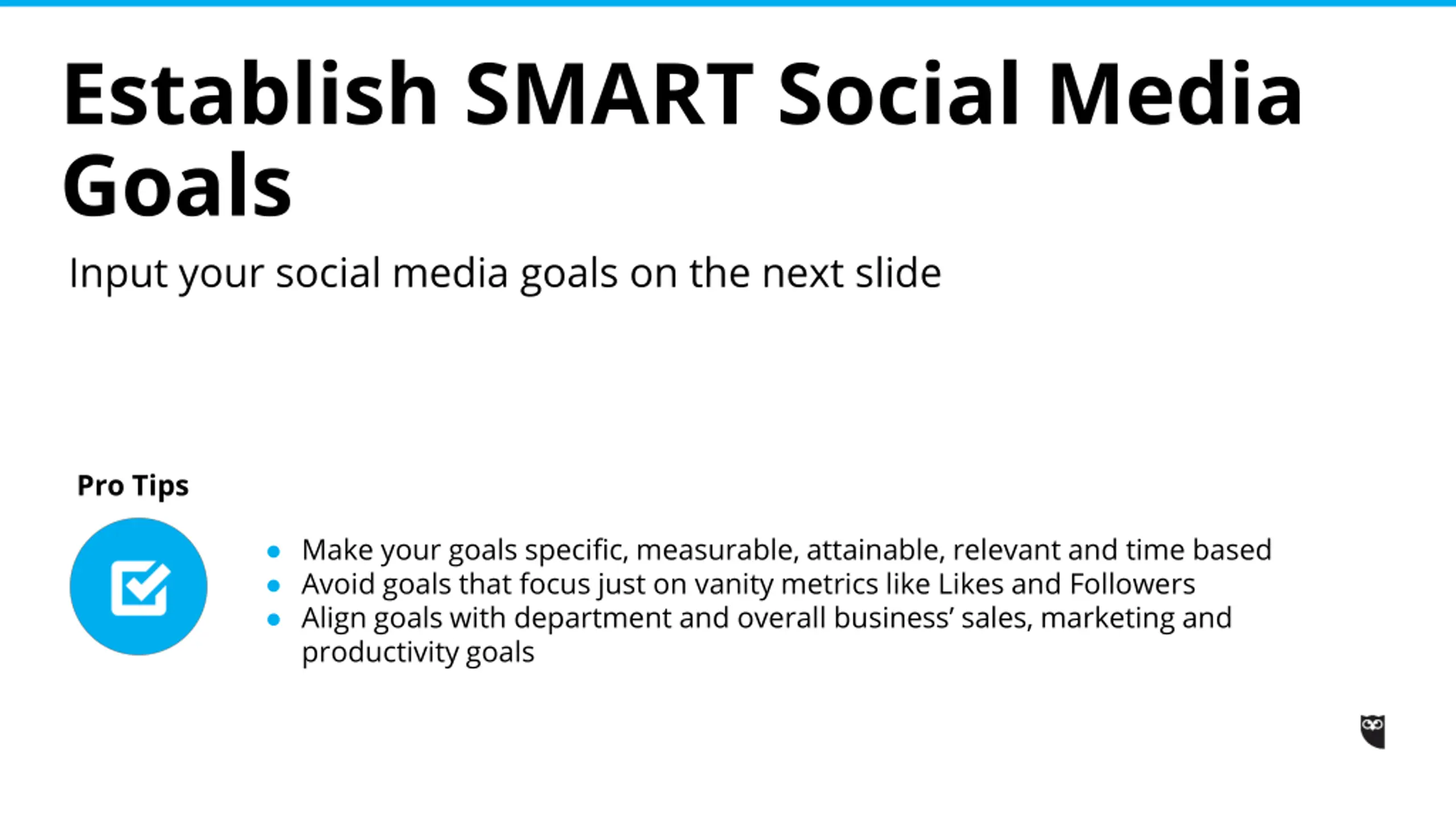 Establish SMART Social Media Goals Input your social media goals on the next slide Pro Tips Make your goals specific, measurable, attainable, relevant and time based Avoid goals that focus just on vanity metrics like Likes and Followers Align goals with department and overall business sales, marketing and productivity goals