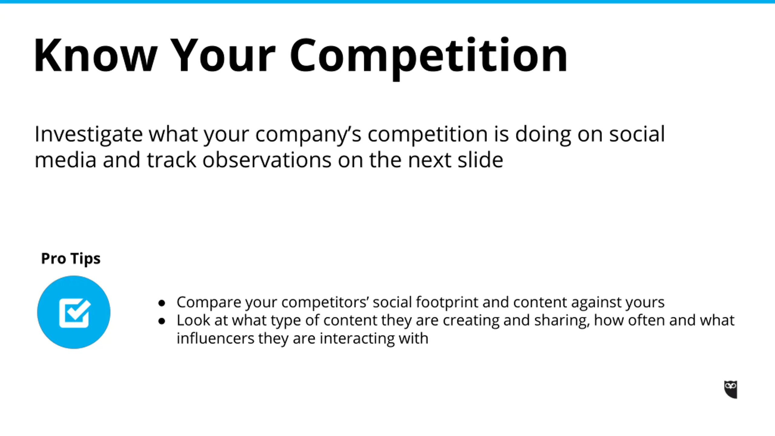 Know Your Competition Investigate what your company s competition is doing on social media and track observations on the next slide Pro Tips Compare your competitors social footprint and content against yours Look at what type of content they are creating and sharing, how often and what influencers they are interacting with