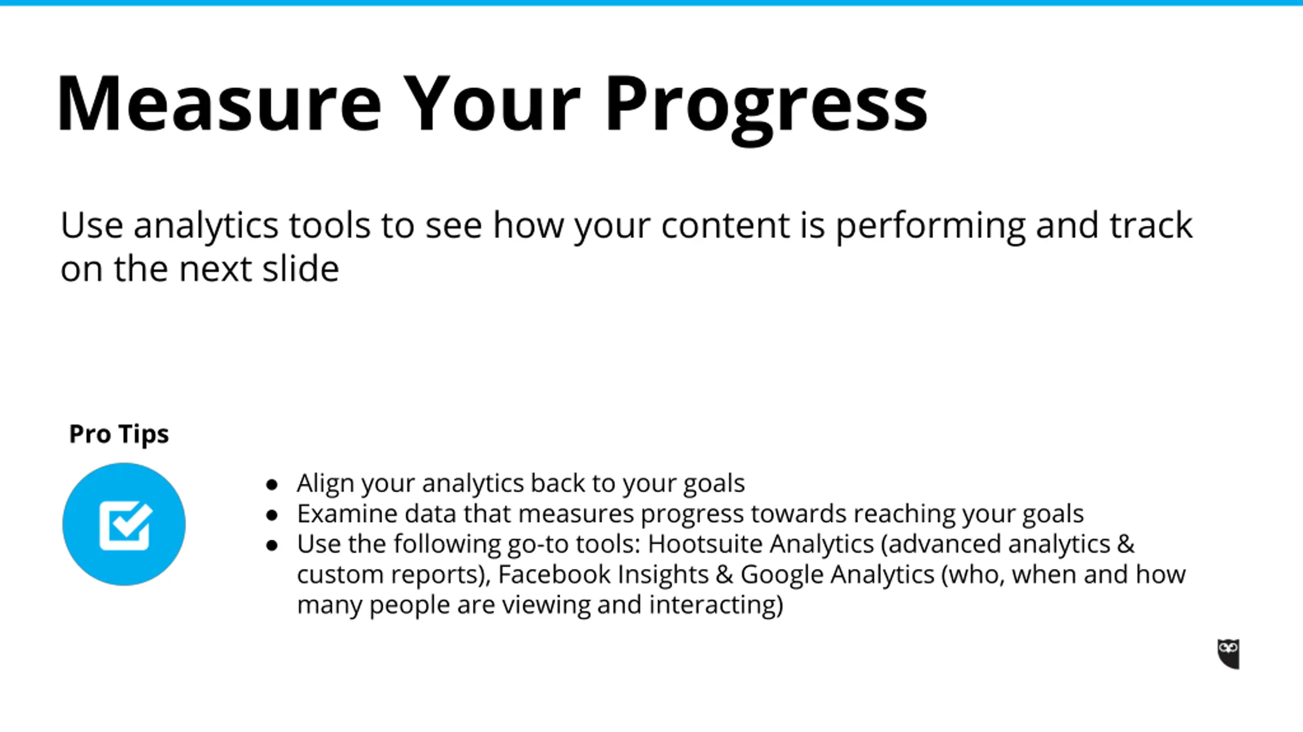Measure Your Progress Use analytics tools to see how your content is performing and track on the next slide Pro Tips Align your analytics back to your goals Examine data that measures progress towards reaching your goals Use the following go-to tools: Hootsuite Analytics (advanced analytics & custom reports), Facebook Insights & Google Analytics (who, when and how many people are viewing and interacting)