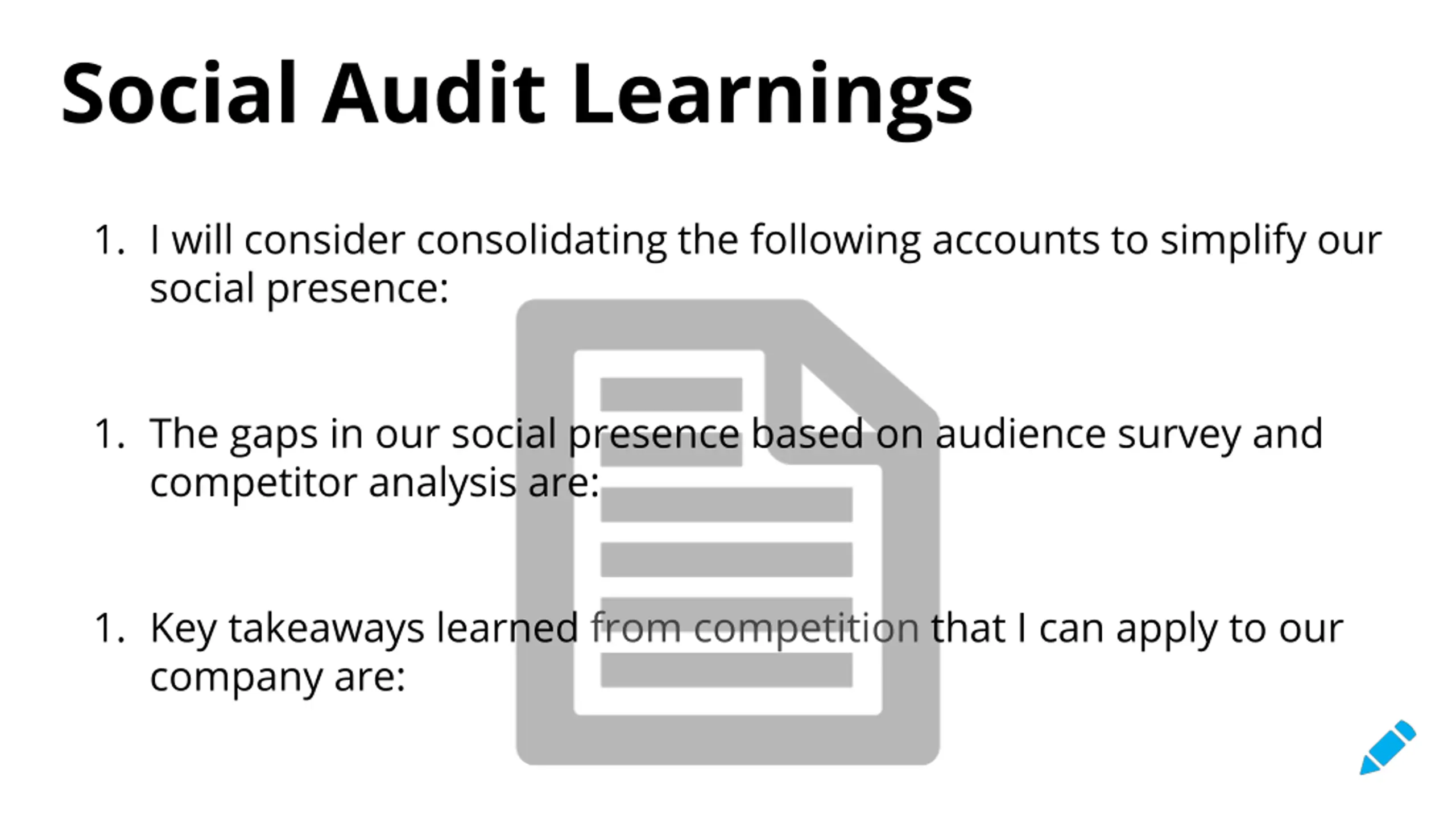 Social Audit Learnings 1. I will consider consolidating the following accounts to simplify our social presence: 1. The gaps in our social presence based on audience survey and competitor analysis are: 1. Key takeaways learned from competition that I can apply to our company are: