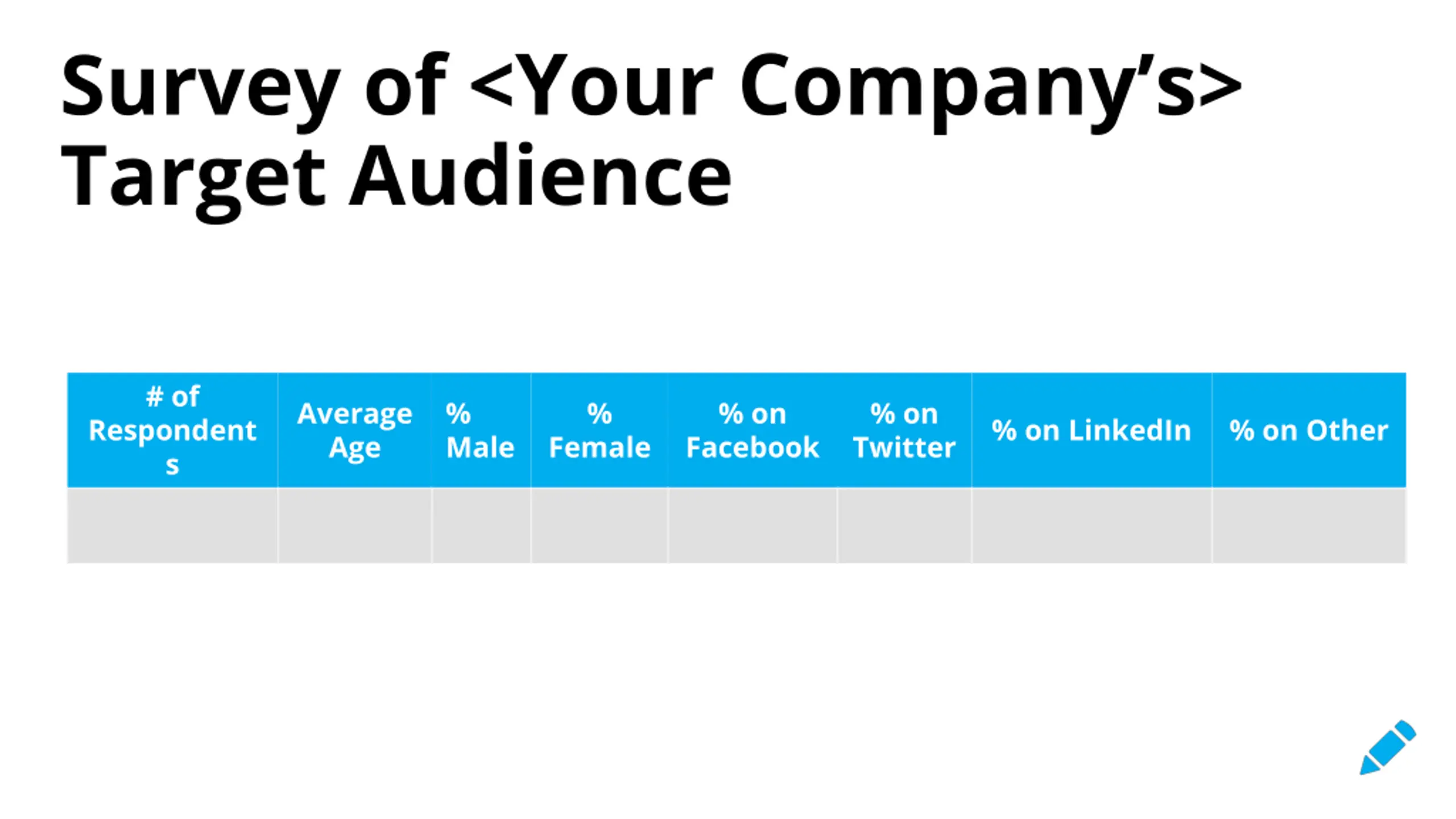 Survey of <Your Companys> Target Audience # of Average Age % Male % % on Facebook % on Twitter Respondent s % on LinkedIn % on Other Female
