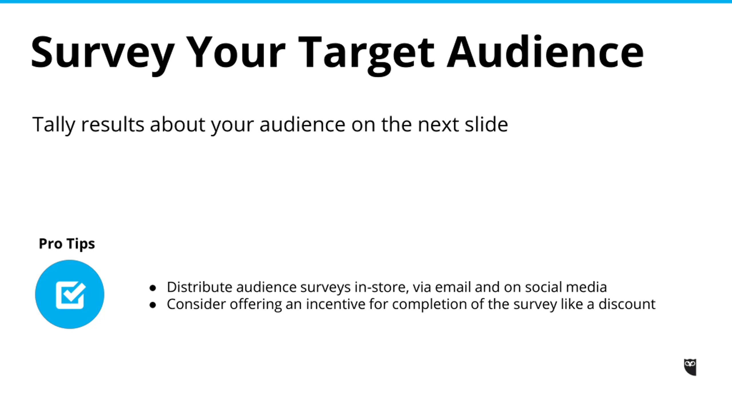 Survey Your Target Audience Tally results about your audience on the next slide Pro Tips Distribute audience surveys in-store, via email and on social media Consider offering an incentive for completion of the survey like a discount