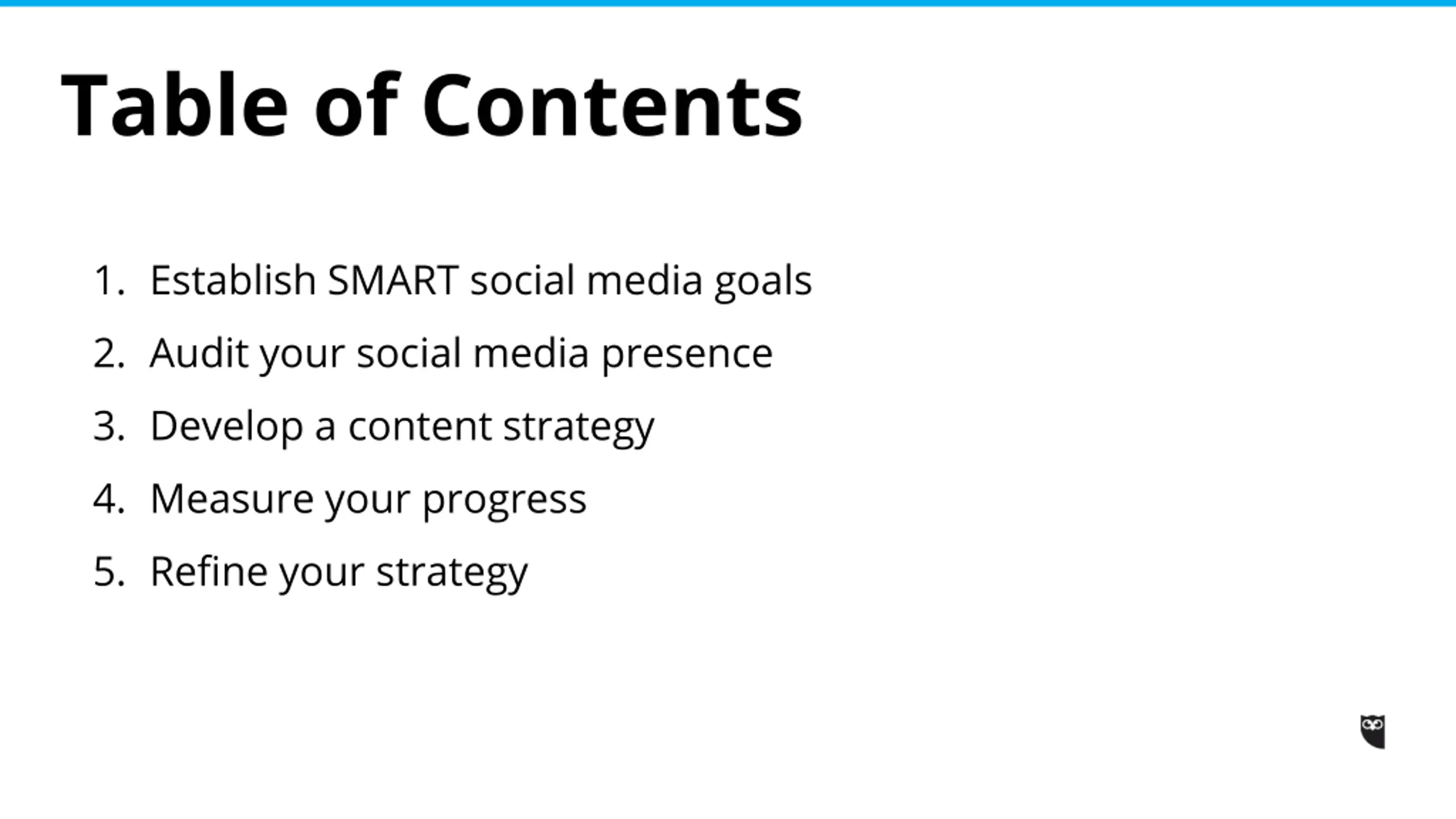 Table of Contents 1. Establish SMART social media goals 2. Audit your social media presence 3. Develop a content strategy 4. Measure your progress 5. Refine your strategy