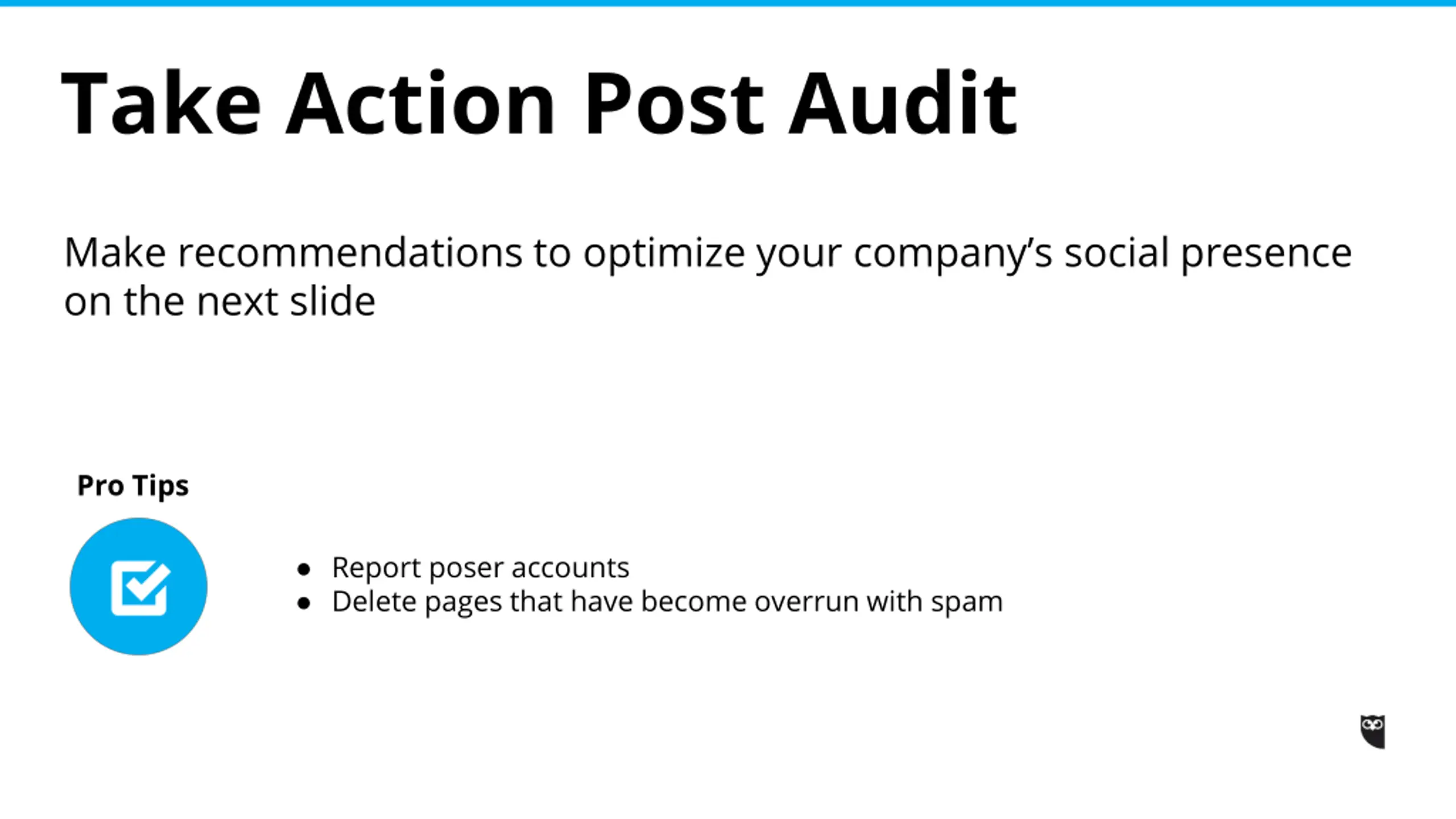 Take Action Post Audit Make recommendations to optimize your company s social presence on the next slide Pro Tips Report poser accounts Delete pages that have become overrun with spam