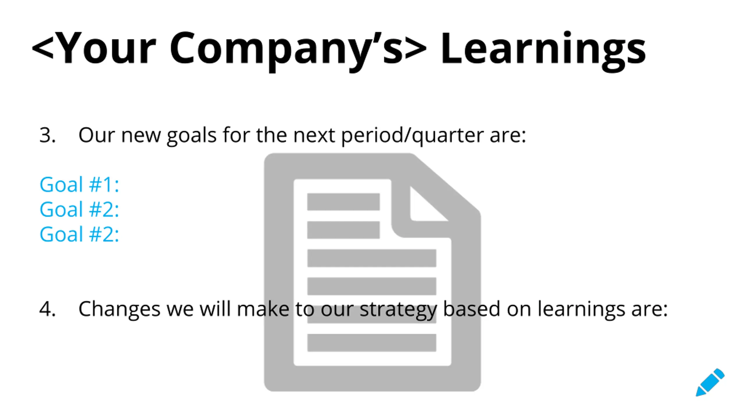 <Your Companys> Learnings 3. Our new goals for the next period/quarter are: Goal #1: Goal #2: Goal #2: 4. Changes we will make to our strategy based on learnings are: