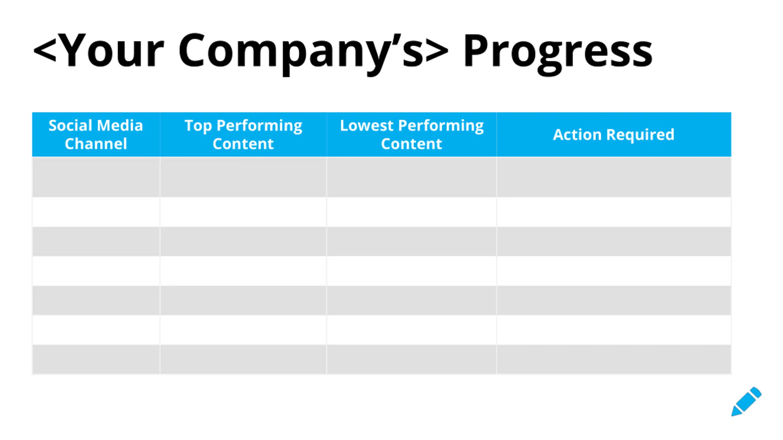 <Your Companys> Progress Social Media Channel Top Performing Content Lowest Performing Content Action Required