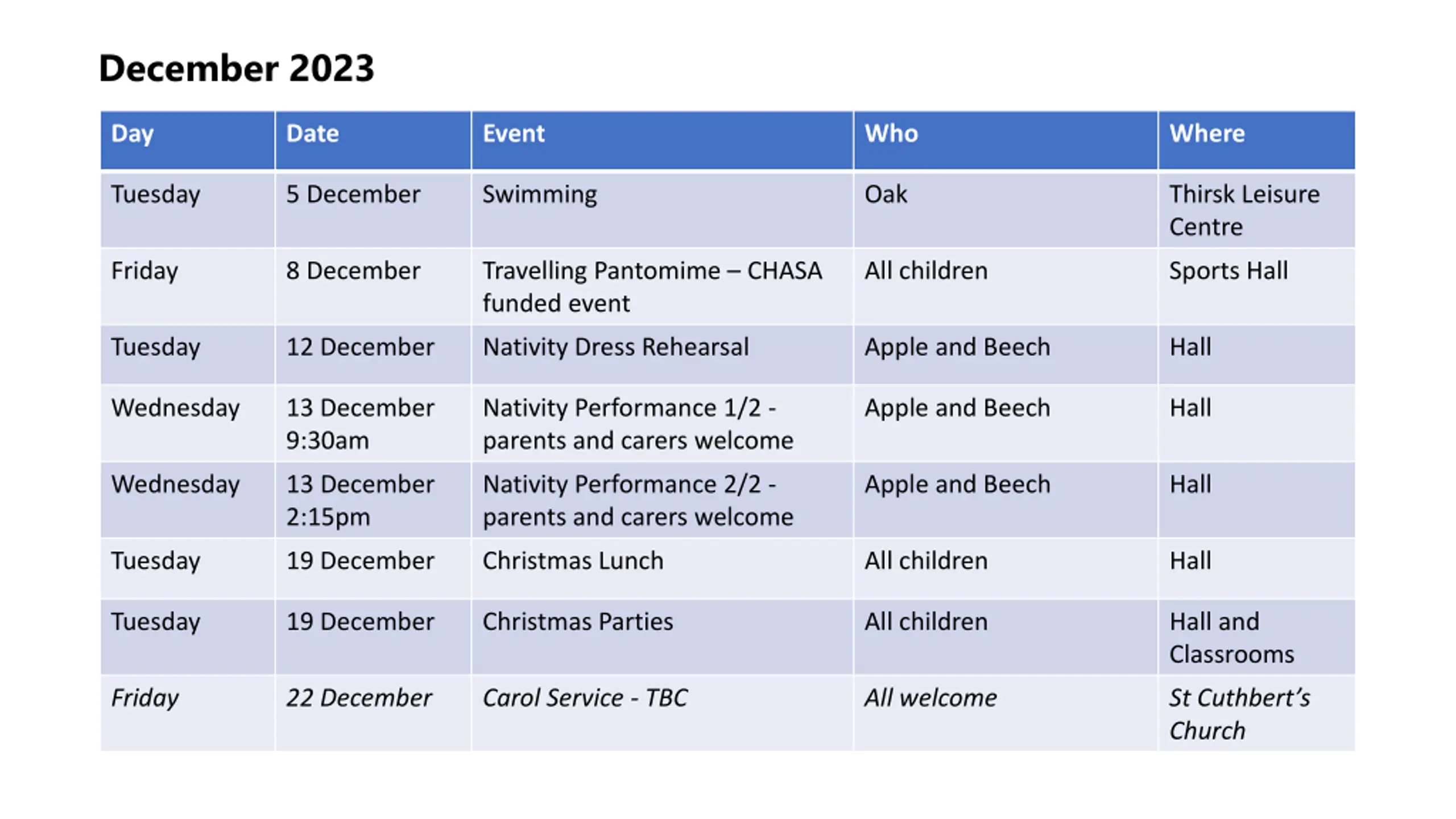 December 2023 Day Date Event Who Where Tuesday 5 December Swimming Oak Thirsk Leisure Centre Friday 8 December Travelling Pantomime CHASA funded event All children Sports Hall Tuesday 12 December Nativity Dress Rehearsal Apple and Beech Hall Wednesday 13 December 9:30am Nativity Performance 1/2 - parents and carers welcome Apple and Beech Hall Wednesday 13 December 2:15pm Nativity Performance 2/2 - parents and carers welcome Apple and Beech Hall Tuesday 19 December Christmas Lunch All children Hall Tuesday 19 December Christmas Parties All children Hall and Classrooms Friday 22 December Carol Service - TBC All welcome St Cuthbert s Church