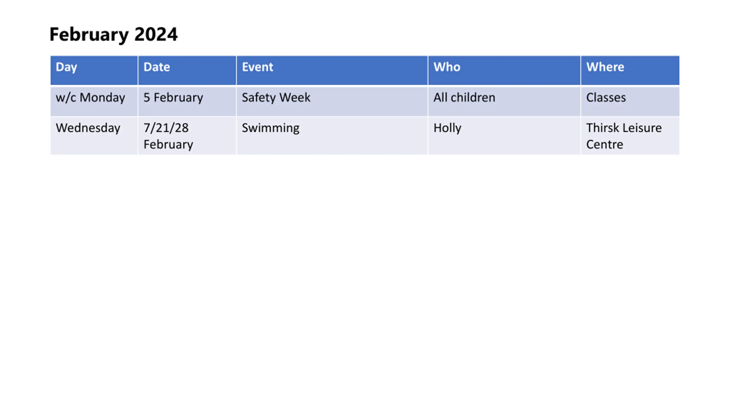 February 2024 Day Date Event Who Where w/c Monday 5 February Safety Week All children Classes Wednesday 7/21/28 February Swimming Holly Thirsk Leisure Centre