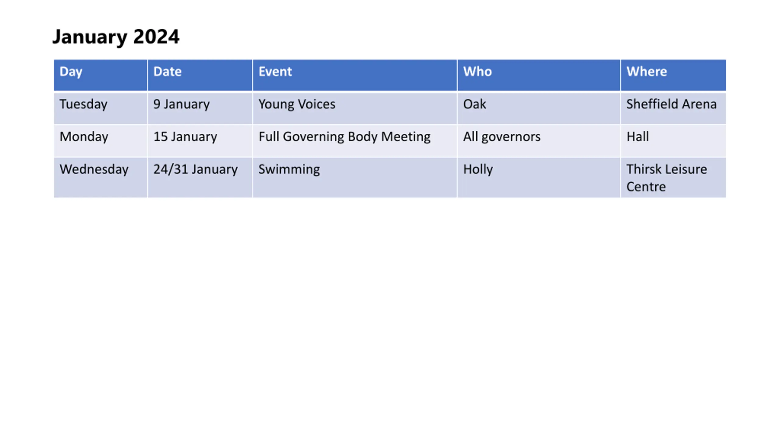 January 2024 Day Date Event Who Where Tuesday 9 January Young Voices Oak Sheffield Arena Monday 15 January Full Governing Body Meeting All governors Hall Wednesday 24/31 January Swimming Holly Thirsk Leisure Centre