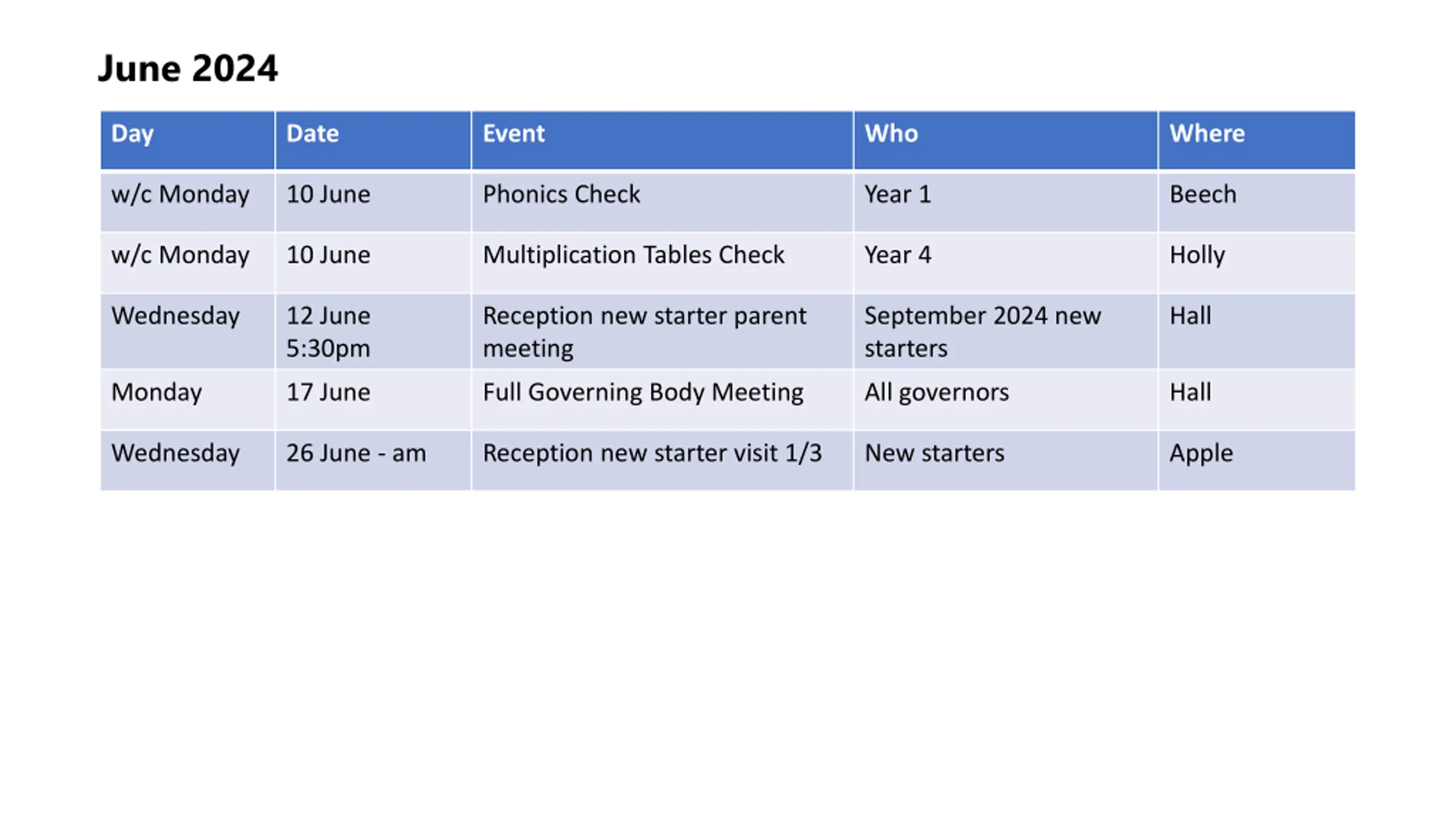 June 2024 Day Date Event Who Where w/c Monday 10 June Phonics Check Year 1 Beech w/c Monday 10 June Multiplication Tables Check Year 4 Holly Wednesday 12 June 5:30pm Reception new starter parent meeting September 2024 new starters Hall Monday 17 June Full Governing Body Meeting All governors Hall Wednesday 26 June - am Reception new starter visit 1/3 New starters Apple