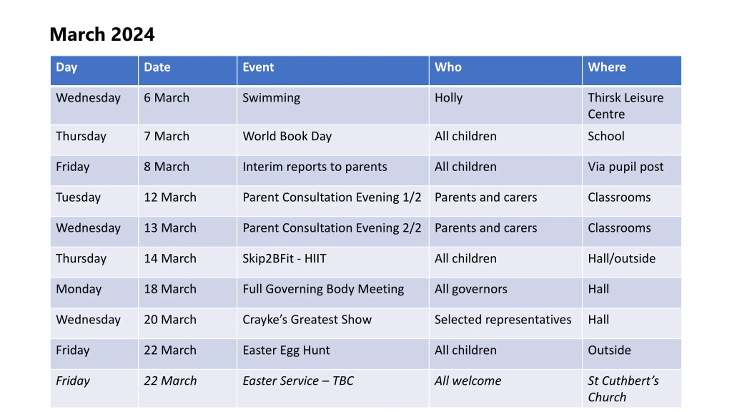 March 2024 Day Date Event Who Where Wednesday 6 March Swimming Holly Thirsk Leisure Centre Thursday 7 March World Book Day All children School Friday 8 March Interim reports to parents All children Via pupil post Tuesday 12 March Parent Consultation Evening 1/2 Parents and carers Classrooms Wednesday 13 March Parent Consultation Evening 2/2 Parents and carers Classrooms Thursday 14 March Skip2BFit - HIIT All children Hall/outside Monday 18 March Full Governing Body Meeting All governors Hall Wednesday 20 March Crayke s Greatest Show Selected representatives Hall Friday 22 March Easter Egg Hunt All children Outside Friday 22 March Easter Service TBC All welcome St Cuthbert s Church