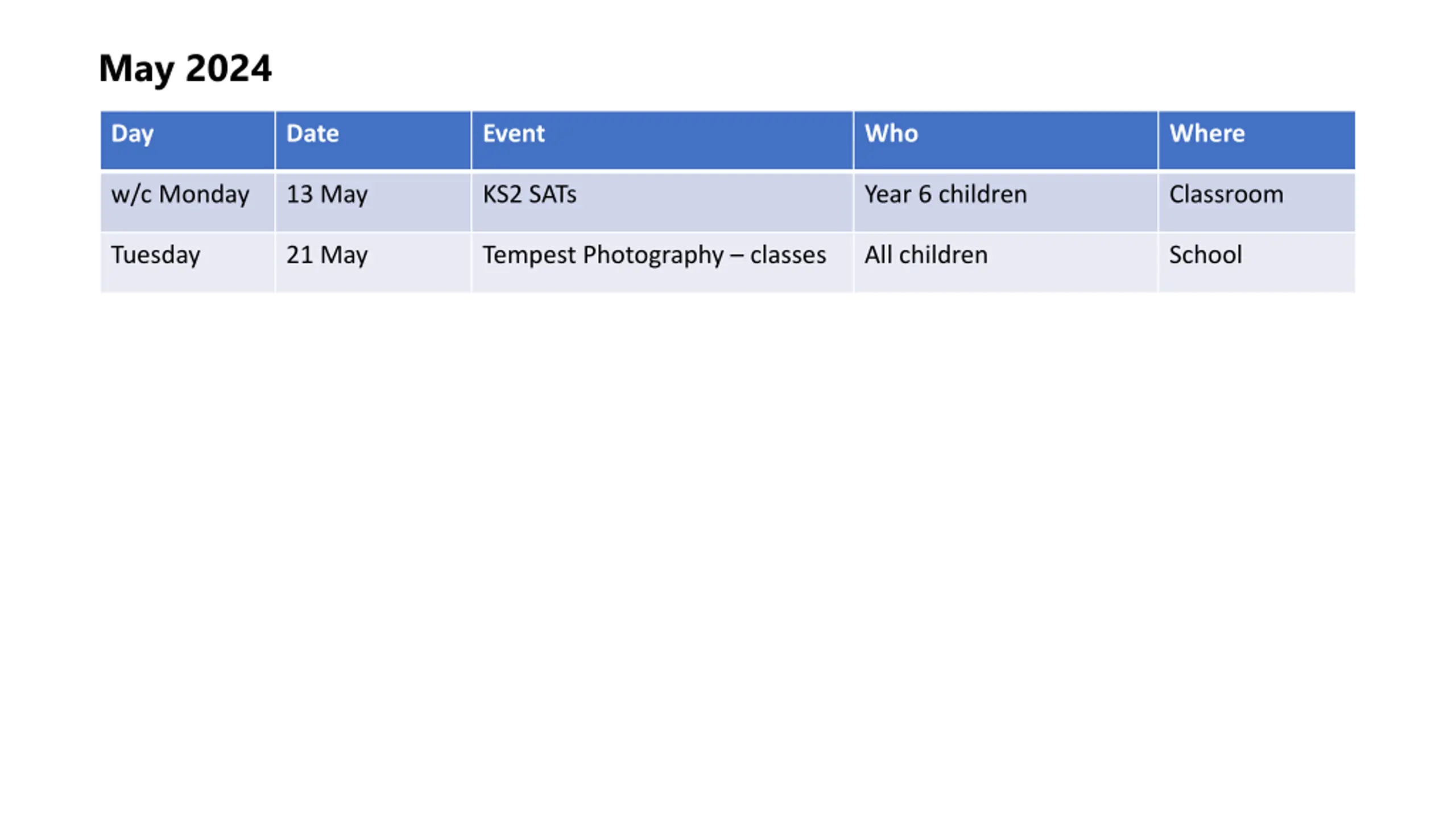 May 2024 Day Date Event Who Where w/c Monday 13 May KS2 SATs Year 6 children Classroom Tuesday 21 May Tempest Photography classes All children School
