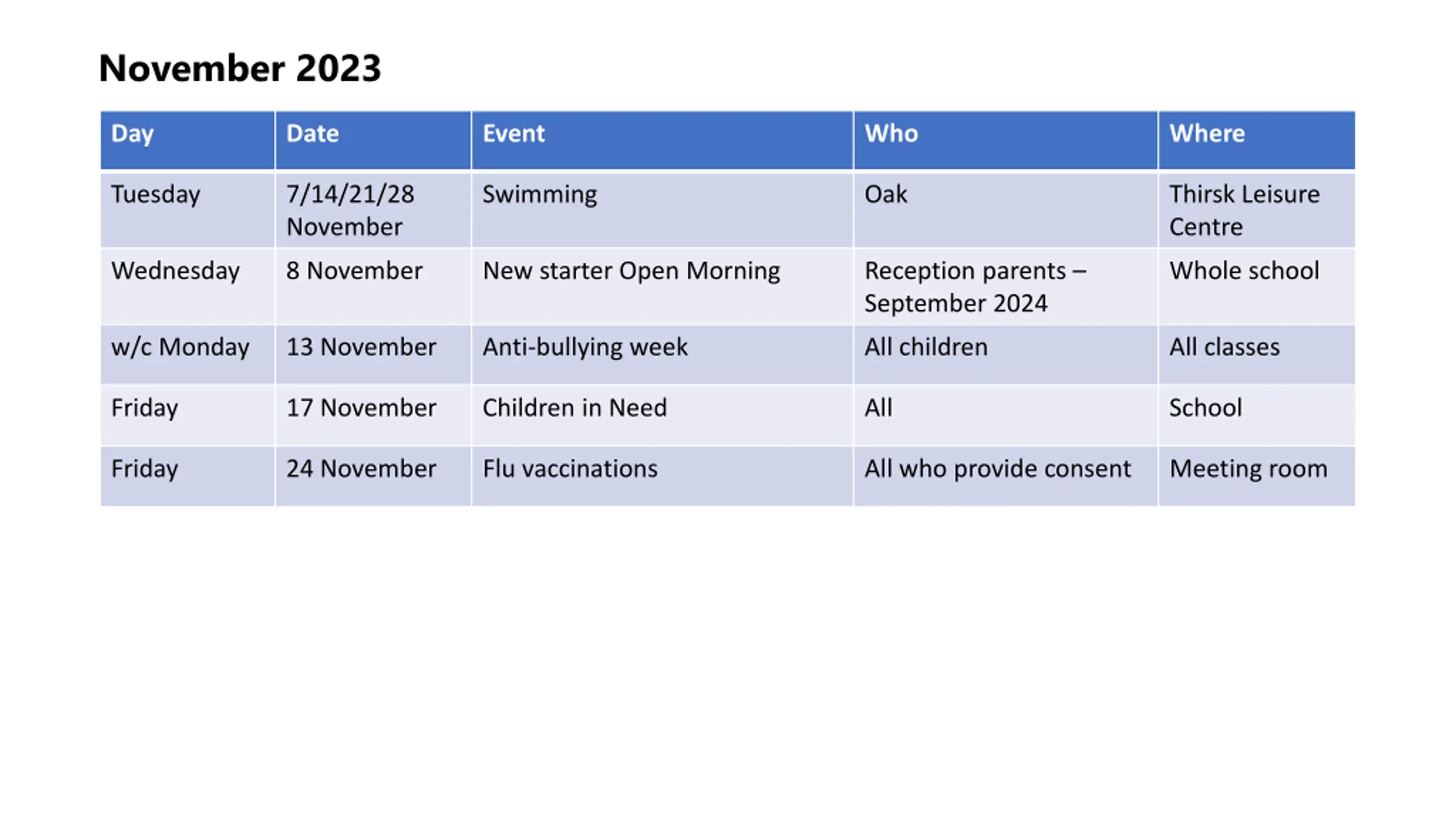 November 2023 Day Date Event Who Where Tuesday 7/14/21/28 November Swimming Oak Thirsk Leisure Centre Wednesday 8 November New starter Open Morning Reception parents September 2024 Whole school w/c Monday 13 November Anti-bullying week All children All classes Friday 17 November Children in Need All School Friday 24 November Flu vaccinations All who provide consent Meeting room