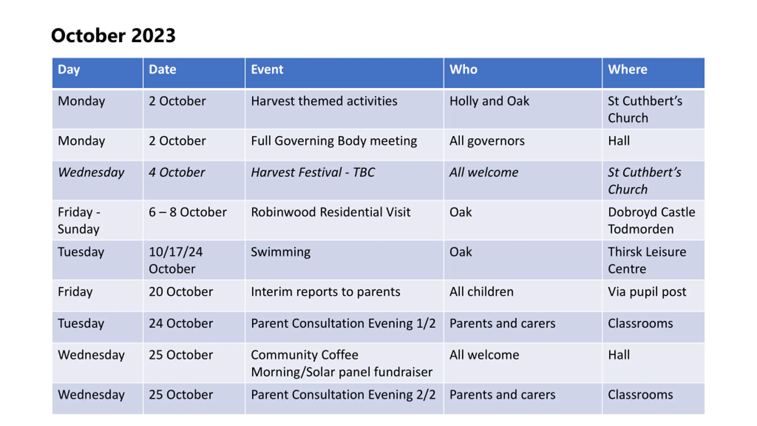 October 2023 Day Date Event Who Where Monday 2 October Harvest themed activities Holly and Oak St Cuthbert s Church Monday 2 October Full Governing Body meeting All governors Hall Wednesday 4 October Harvest Festival - TBC All welcome St Cuthbert s Church Friday - Sunday 6 8 October Robinwood Residential Visit Oak Dobroyd Castle Todmorden Tuesday 10/17/24 October Swimming Oak Thirsk Leisure Centre Friday 20 October Interim reports to parents All children Via pupil post Tuesday 24 October Parent Consultation Evening 1/2 Parents and carers Classrooms Wednesday 25 October Community Coffee Morning/Solar panel fundraiser All welcome Hall Wednesday 25 October Parent Consultation Evening 2/2 Parents and carers Classrooms