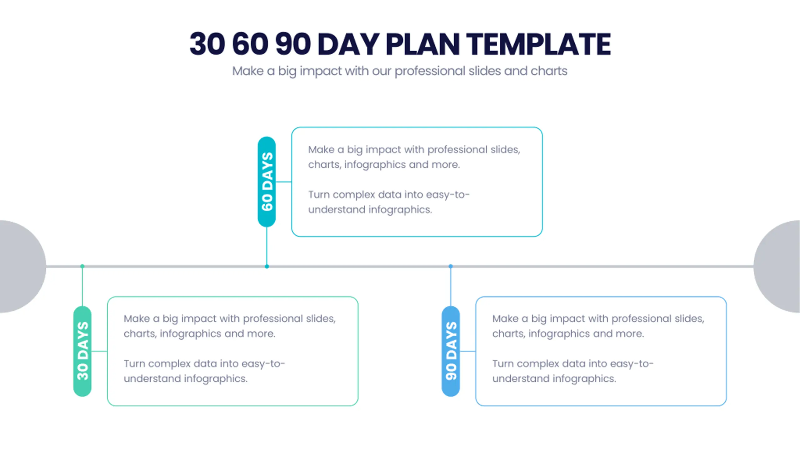 30 60 90 DAY PLAN TEMPLATE Make a big impact with our professional slides and charts Make a big impact with professional slides, charts, infographics and more. 60 DAYS Turn complex data into easy-to- understand infographics. Make a big impact with professional slides, charts, infographics and more. Make a big impact with professional slides, charts, infographics and more. 90 DAYS 30 DAYS Turn complex data into easy-to- understand infographics. Turn complex data into easy-to- understand infographics.