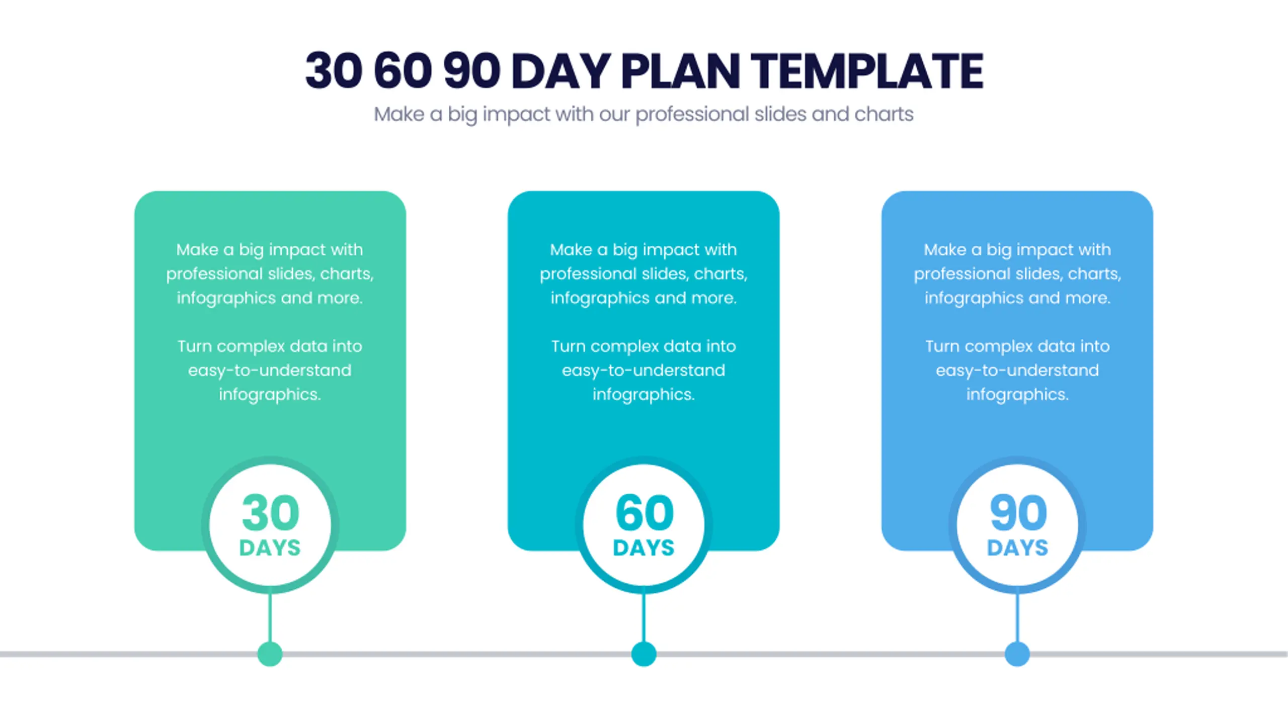 30 60 90 DAY PLAN TEMPLATE Make a big impact with our professional slides and charts 30 60 90 DAYS DAYS DAYS Make a big impact with professional slides, charts, infographics and more. Make a big impact with professional slides, charts, infographics and more. Make a big impact with professional slides, charts, infographics and more. Turn complex data into easy-to-understand infographics. Turn complex data into easy-to-understand infographics. Turn complex data into easy-to-understand infographics.