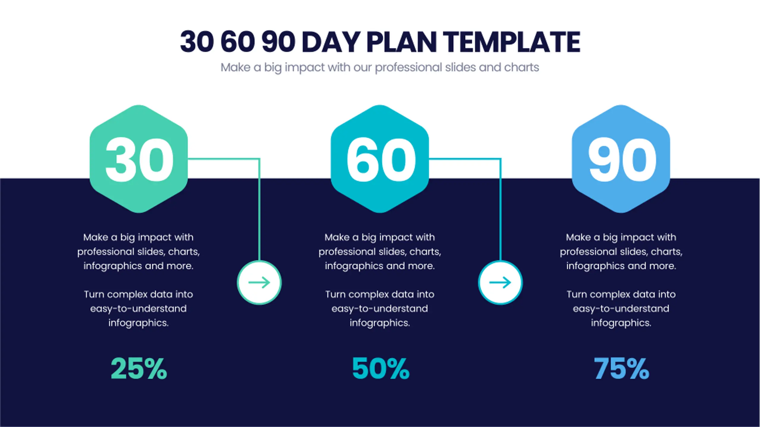 30 60 90 DAY PLAN TEMPLATE Make a big impact with our professional slides and charts 30 60 90 Make a big impact with professional slides, charts, infographics and more. Make a big impact with professional slides, charts, infographics and more. Make a big impact with professional slides, charts, infographics and more. Turn complex data into easy-to-understand infographics. Turn complex data into easy-to-understand infographics. Turn complex data into easy-to-understand infographics. 25% 50% 75%
