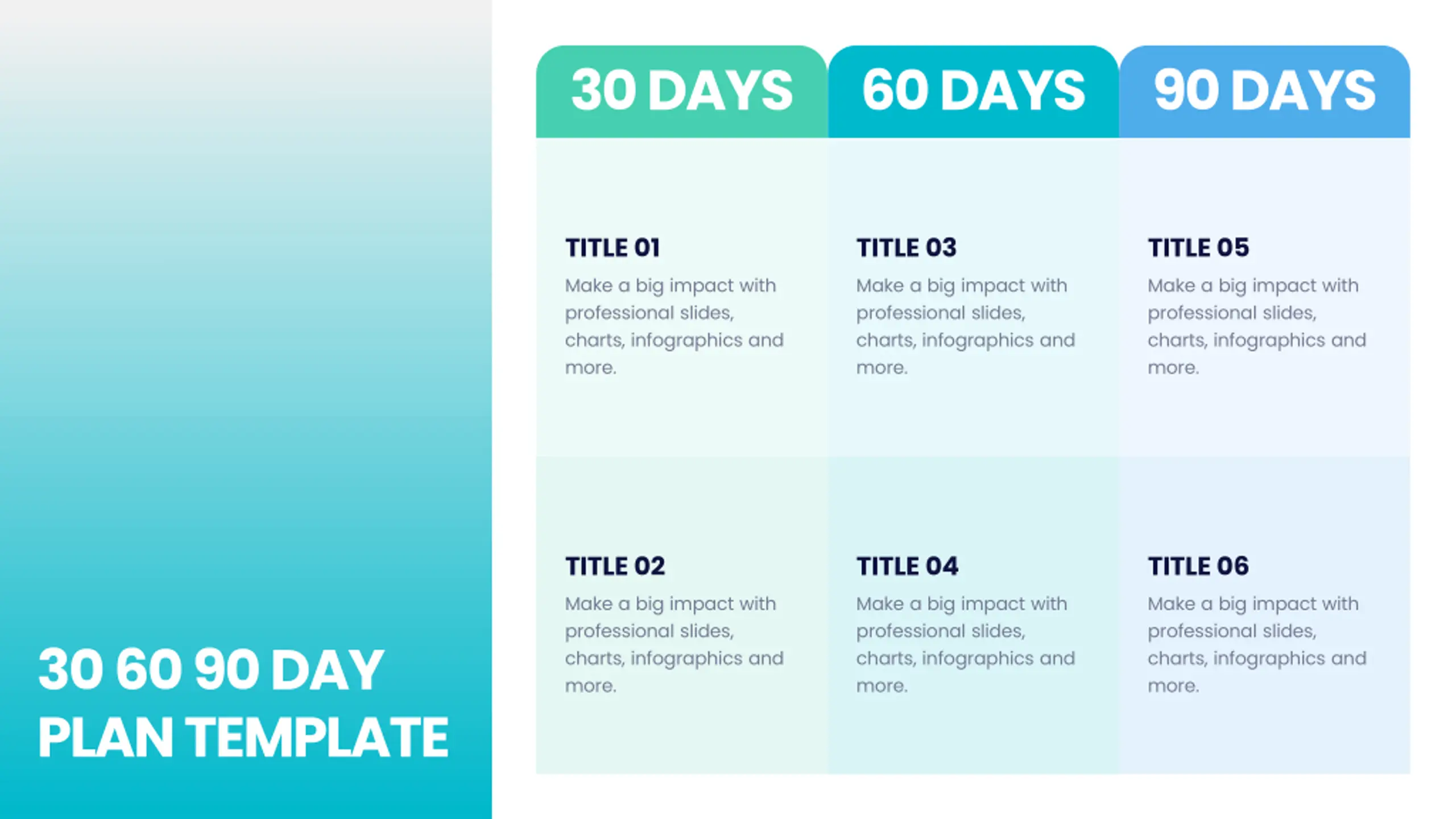 30 DAYS 60 DAYS 90 DAYS TITLE 01 Make a big impact with professional slides, charts, infographics and more. TITLE 03 Make a big impact with professional slides, charts, infographics and more. TITLE 05 Make a big impact with professional slides, charts, infographics and more. TITLE 02 Make a big impact with professional slides, charts, infographics and more. TITLE 04 Make a big impact with professional slides, charts, infographics and more. TITLE 06 Make a big impact with professional slides, charts, infographics and more. 30 60 90 DAY PLAN TEMPLATE