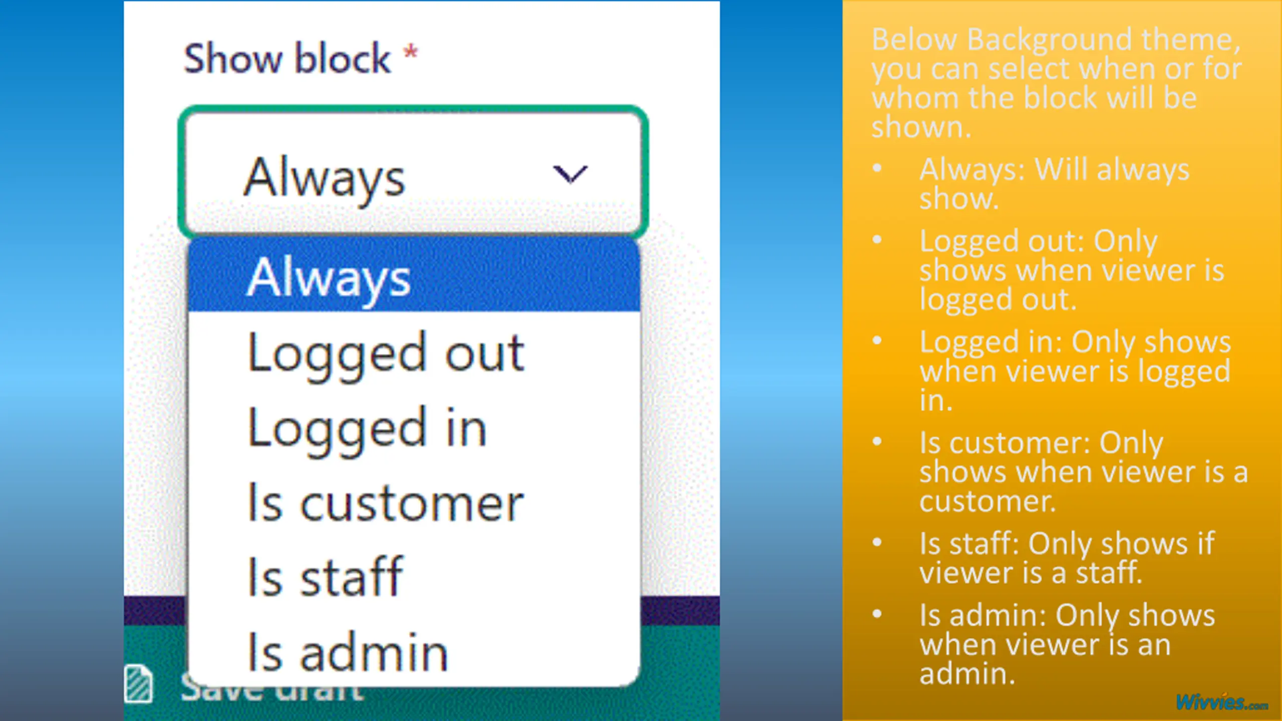 Below Background theme, you can select when or for whom the block will be shown. Always: Will always show. Logged out: Only shows when viewer is logged out. Logged in: Only shows when viewer is logged in. Is customer: Only shows when viewer is a customer. Is staff: Only shows if viewer is a staff. Is admin: Only shows when viewer is an admin.