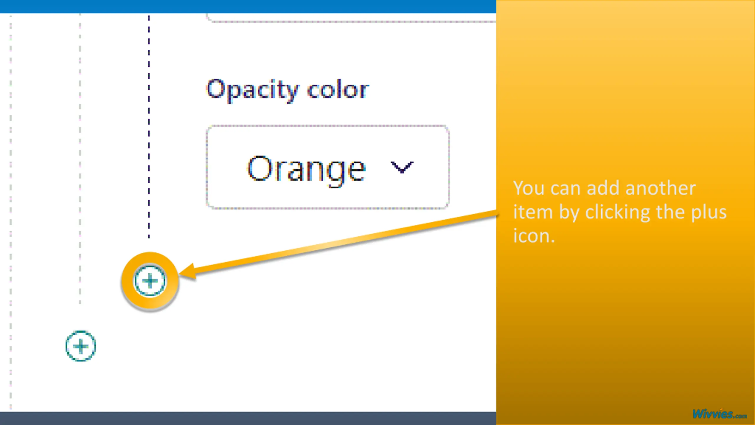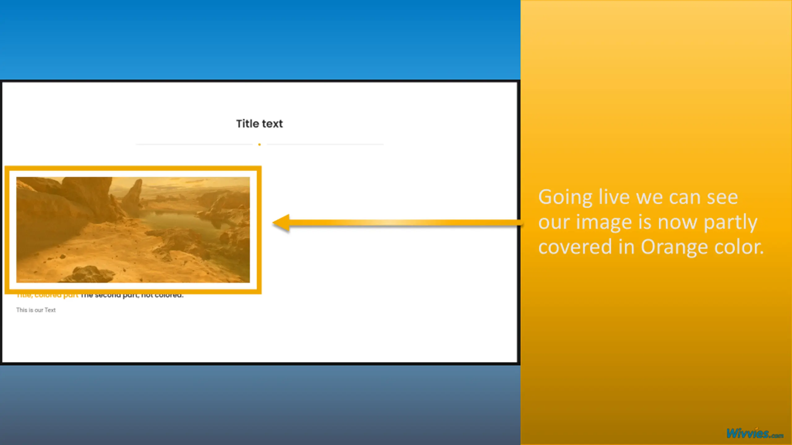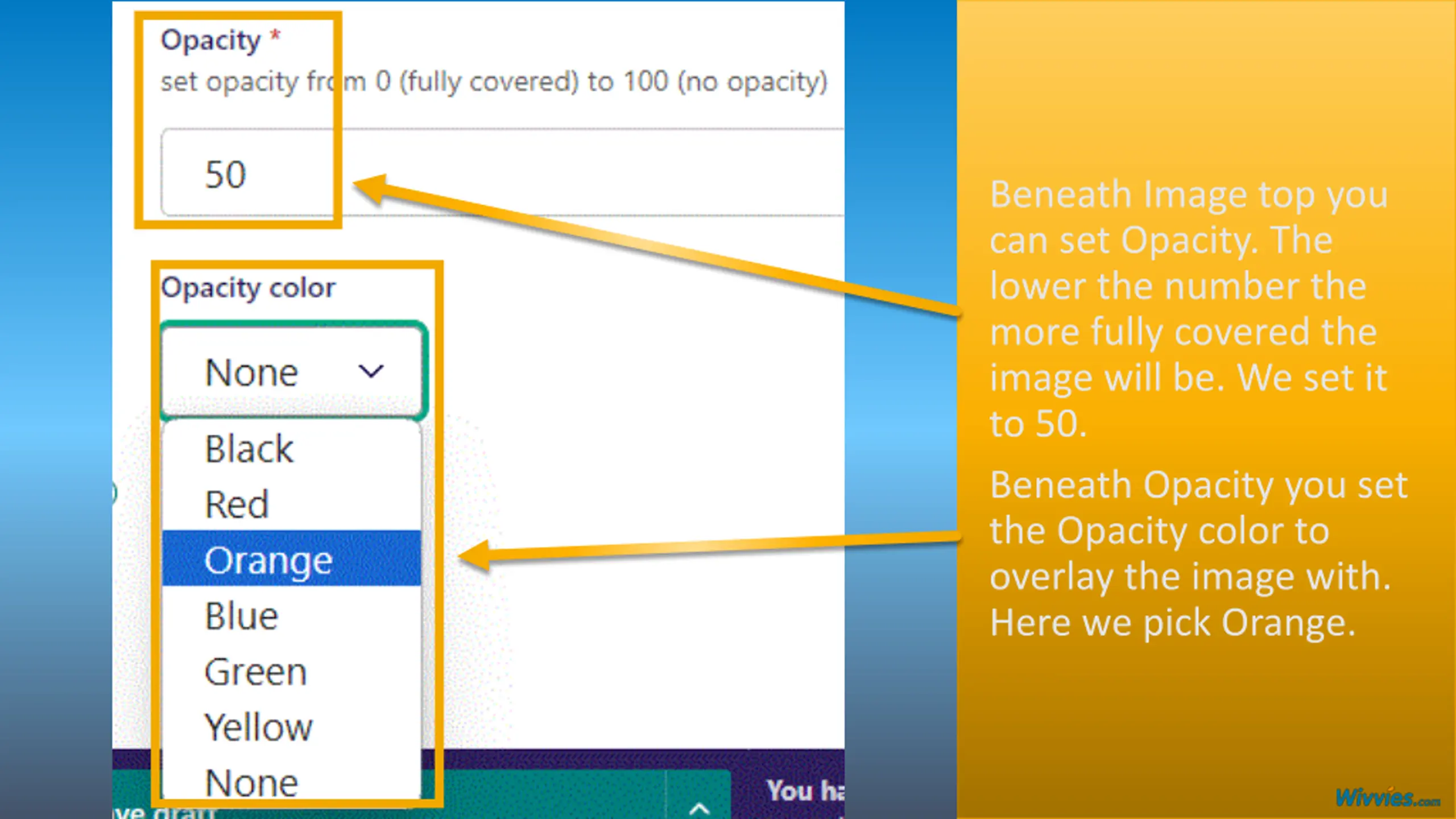 Beneath Image top you can set Opacity. The lower the number the more fully covered the image will be. We set it to 50. Beneath Opacity you set the Opacity color to overlay the image with. Here we pick Orange.