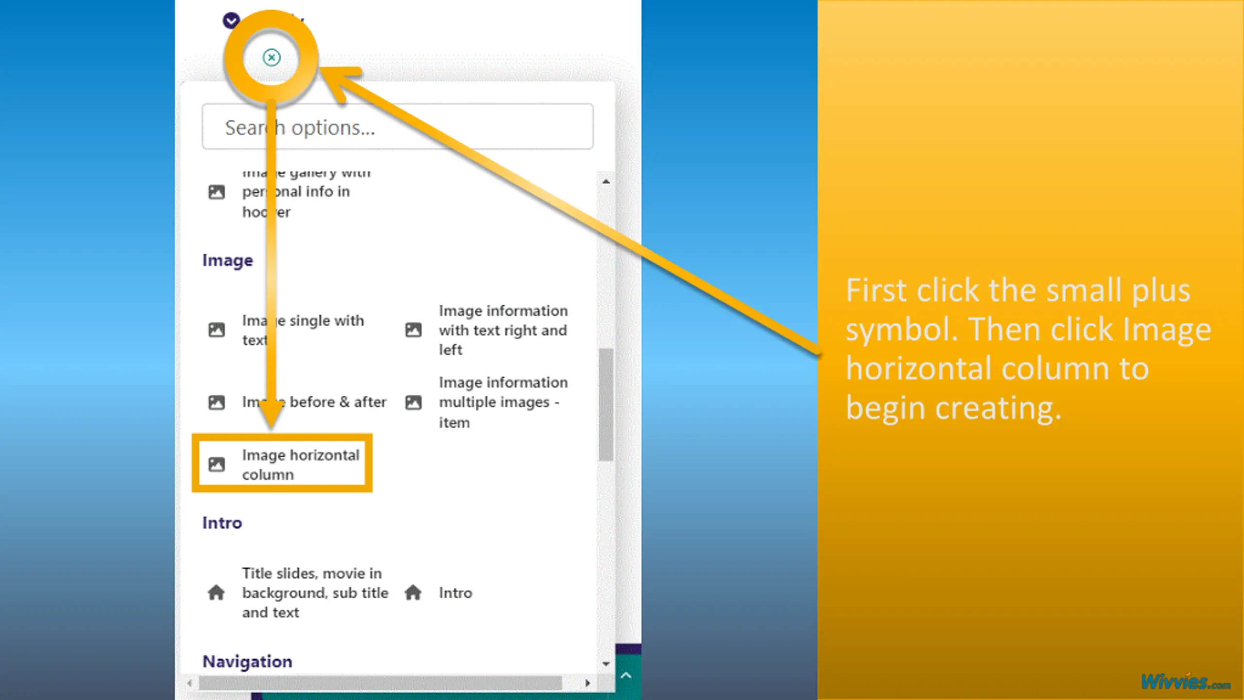 First click the small plus symbol. Then click Image horizontal column to begin creating.