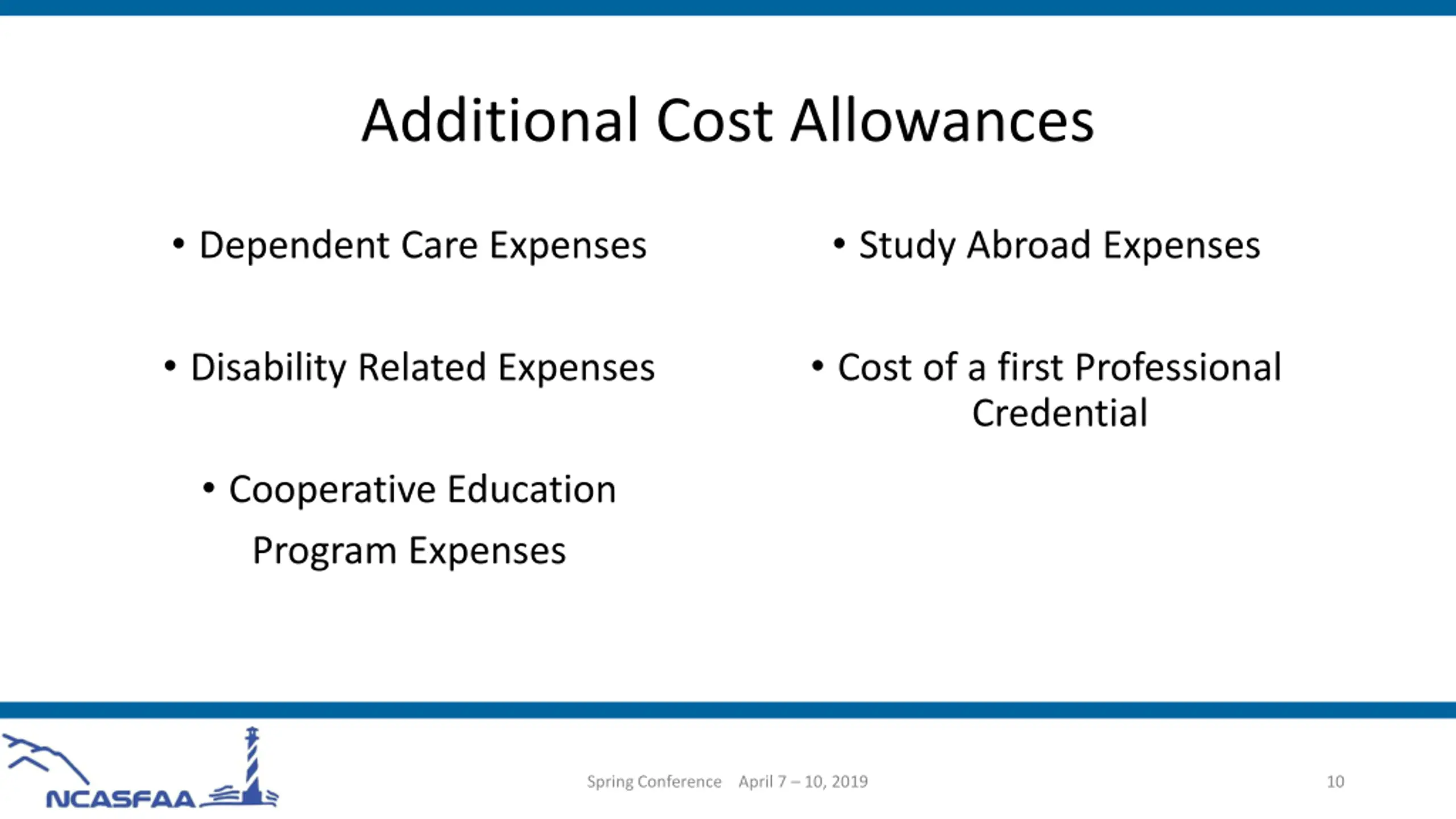 Additional Cost Allowances Dependent Care Expenses Study Abroad Expenses Disability Related Expenses Cost of a first Professional Credential Cooperative Education Program Expenses Spring Conference April 7 10, 2019 10