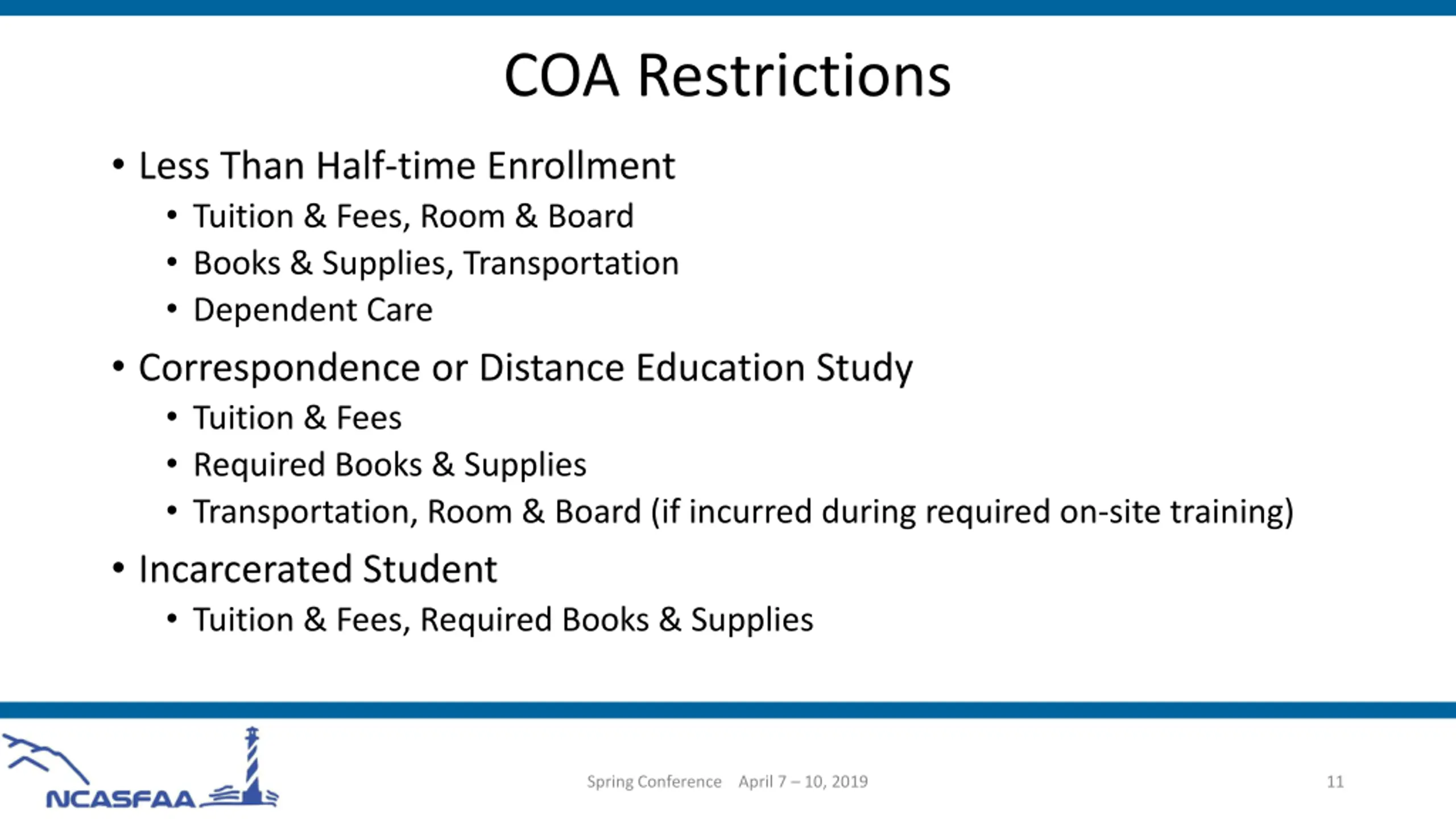 COA Restrictions Less Than Half-time Enrollment Tuition & Fees, Room & Board Books & Supplies, Transportation Dependent Care Correspondence or Distance Education Study Tuition & Fees Required Books & Supplies Transportation, Room & Board (if incurred during required on-site training) Incarcerated Student Tuition & Fees, Required Books & Supplies Spring Conference April 7 10, 2019 11