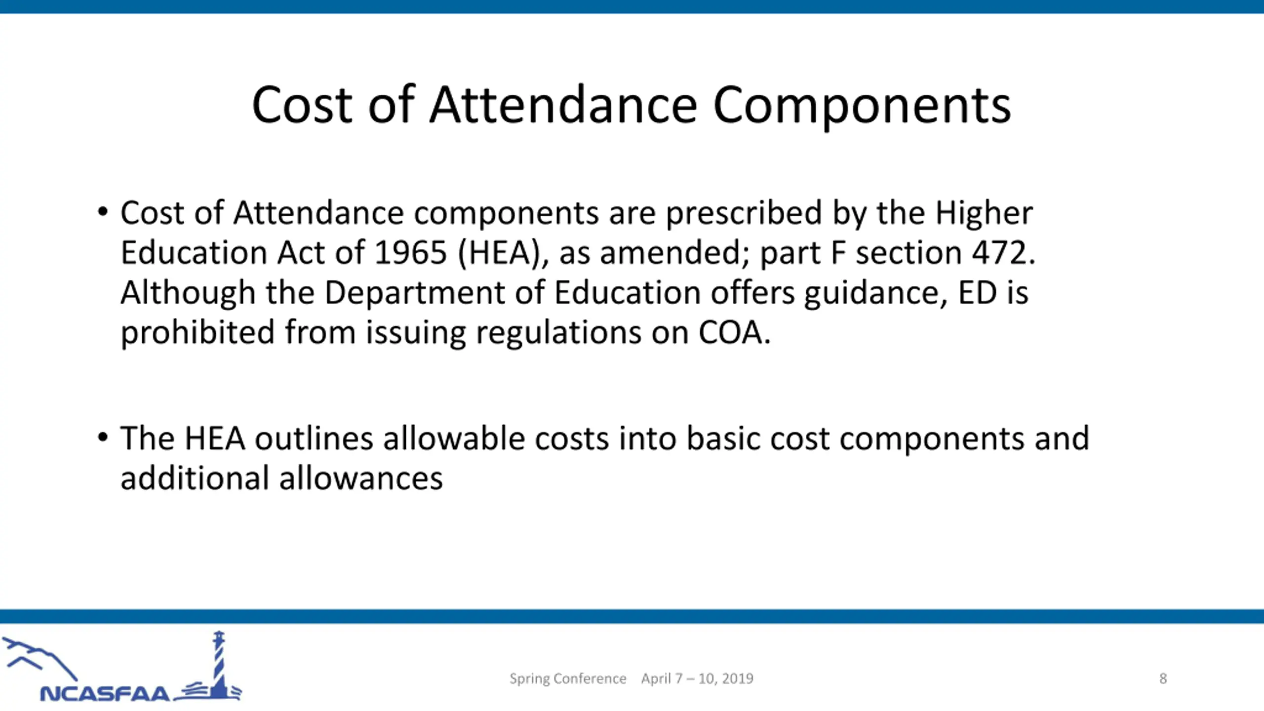 Cost of Attendance Components Cost of Attendance components are prescribed by the Higher Education Act of 1965 (HEA), as amended; part F section 472. Although the Department of Education offers guidance, ED is prohibited from issuing regulations on COA. The HEA outlines allowable costs into basic cost components and additional allowances Spring Conference April 7 10, 2019 8
