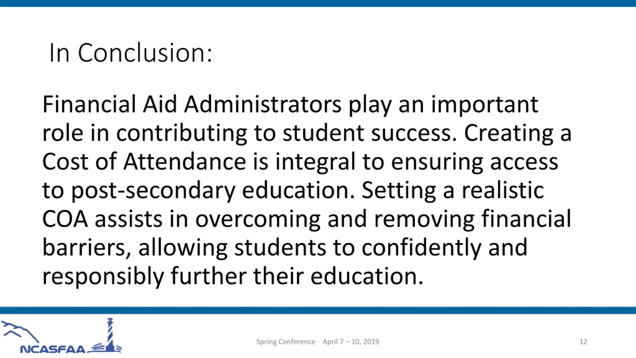 In Conclusion: Financial Aid Administrators play an important role in contributing to student success. Creating a Cost of Attendance is integral to ensuring access to post-secondary education. Setting a realistic COA assists in overcoming and removing financial barriers, allowing students to confidently and responsibly further their education. Spring Conference April 7 10, 2019 12