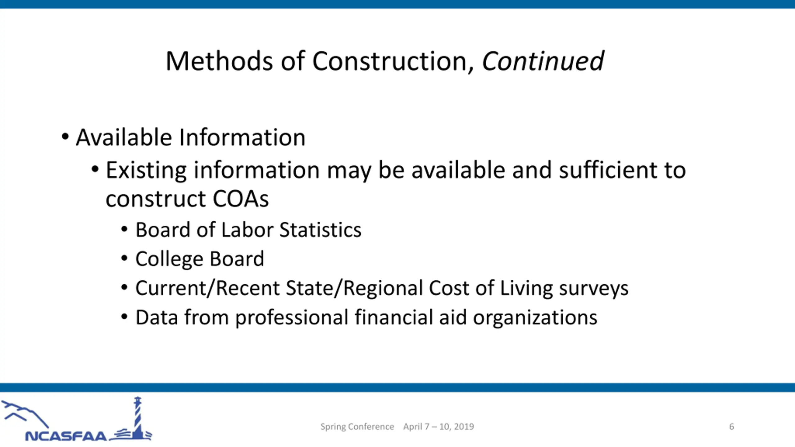 Methods of Construction, Continued Available Information Existing information may be available and sufficient to construct COAs Board of Labor Statistics College Board Current/Recent State/Regional Cost of Living surveys Data from professional financial aid organizations Spring Conference April 7 10, 2019 6