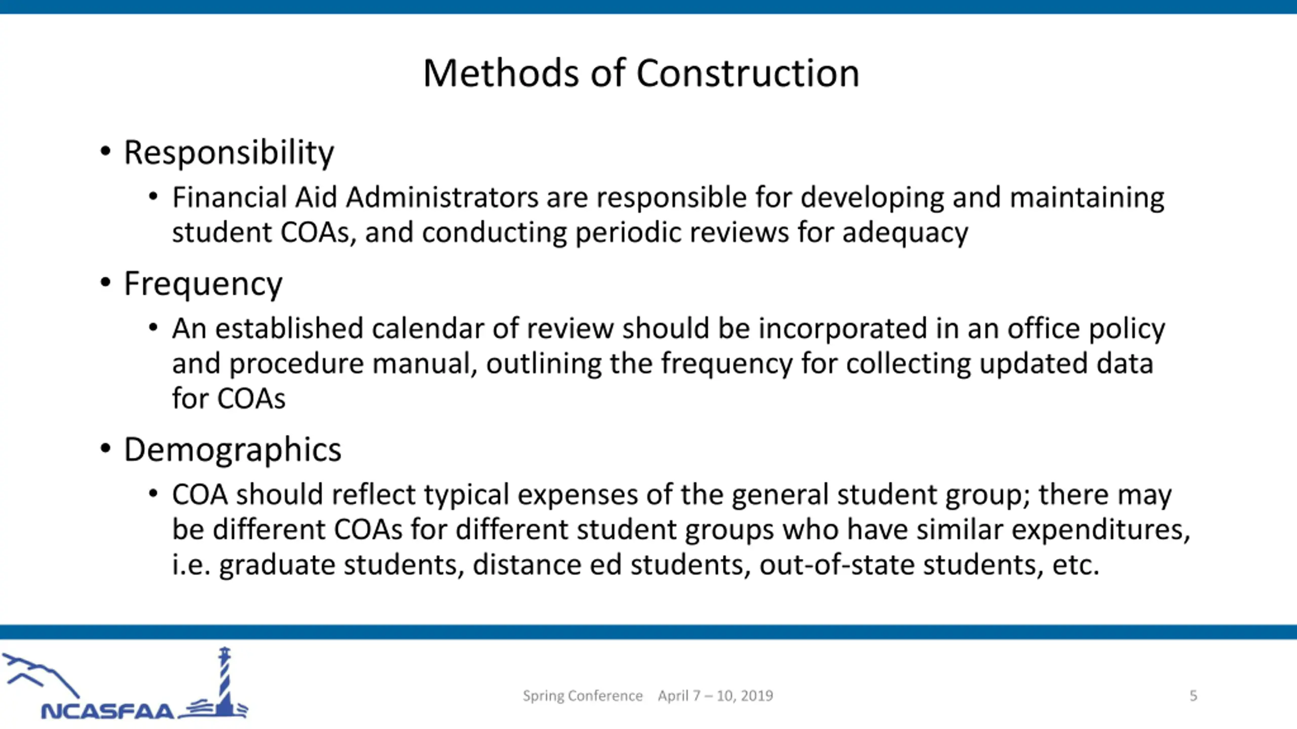 Methods of Construction Responsibility Financial Aid Administrators are responsible for developing and maintaining student COAs, and conducting periodic reviews for adequacy Frequency An established calendar of review should be incorporated in an office policy and procedure manual, outlining the frequency for collecting updated data for COAs Demographics COA should reflect typical expenses of the general student group; there may be different COAs for different student groups who have similar expenditures, i.e. graduate students, distance ed students, out-of-state students, etc. Spring Conference April 7 10, 2019 5