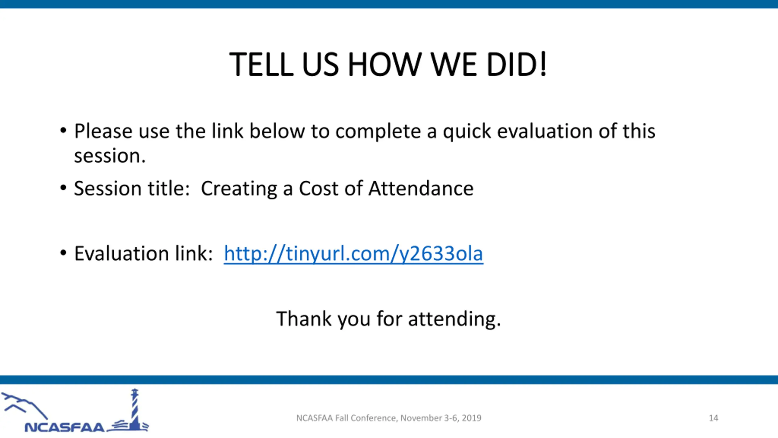 TELL US HOW WE DID! TELL US HOW WE DID! Please use the link below to complete a quick evaluation of this session. Session title: Creating a Cost of Attendance Evaluation link: http://tinyurl.com/y2633ola Thank you for attending. NCASFAA Fall Conference, November 3-6, 2019 14