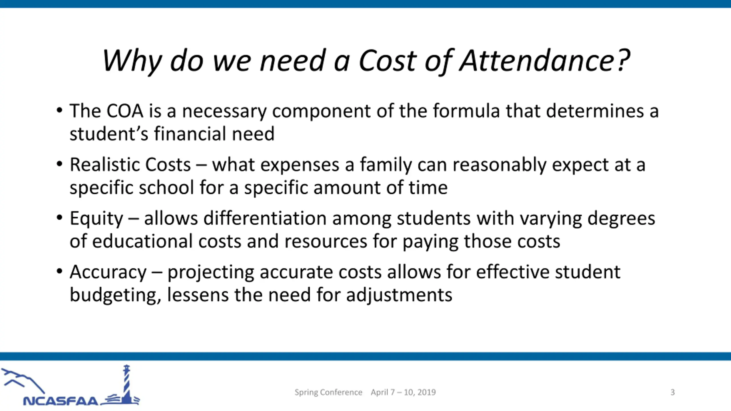What is a Cost of Attendance? The Cost of Attendance (COA) is a reasonable, best estimate of the costs a student may incur during a specific period of enrollment, such as an academic year. Also sometimes referred to as a budget, the COA is integral in establishing a student s financial need and setting a limit on the total amount of aid a student may receive for that specific time period. Spring Conference April 7 10, 2019 2