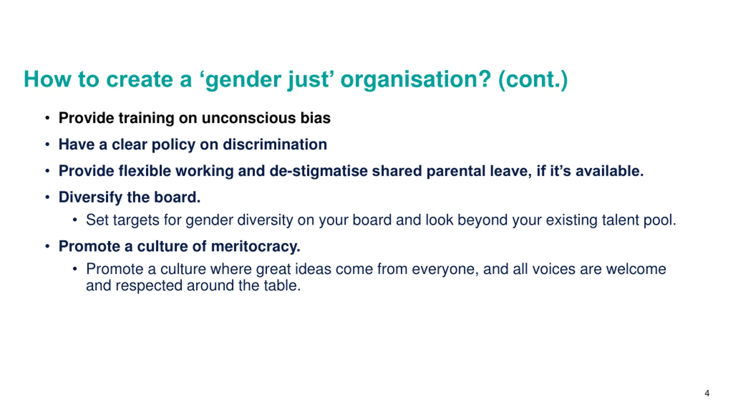 How to create a gender just organisation? Be transparent Report on your gender statistics transparently. This is the law for companies over a certain size in some countries. Support women into more senior roles Set gender targets, broken down by business lines and functions. Make sure that female employees are applying for promotions and asking for pay rises. Implement gender neutral recruitment processes Carefully word your job adverts. Research shows that adjectives such as competitive and determined put off women. On the other hand, words such as collaborative and cooperative tend to attract more women than men. Review salaries and standardise pay 3