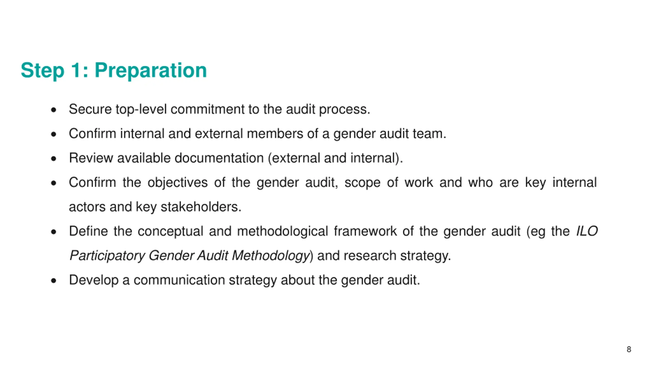 Step 1: Preparation Secure top-level commitment to the audit process. Confirm internal and external members of a gender audit team. Review available documentation (external and internal). Confirm the objectives of the gender audit, scope of work and who are key internal actors and key stakeholders. Define the conceptual and methodological framework of the gender audit (eg the ILO Participatory Gender Audit Methodology) and research strategy. Develop a communication strategy about the gender audit. 8