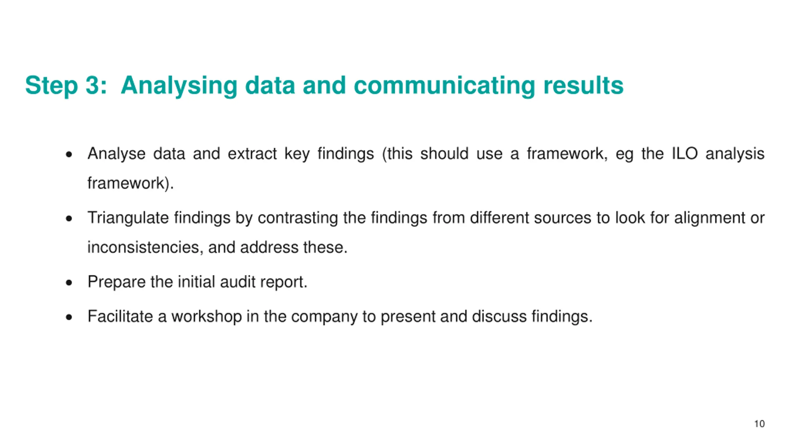 Step 3: Analysing data and communicating results Analyse data and extract key findings (this should use a framework, eg the ILO analysis framework). Triangulate findings by contrasting the findings from different sources to look for alignment or inconsistencies, and address these. Prepare the initial audit report. Facilitate a workshop in the company to present and discuss findings. 10