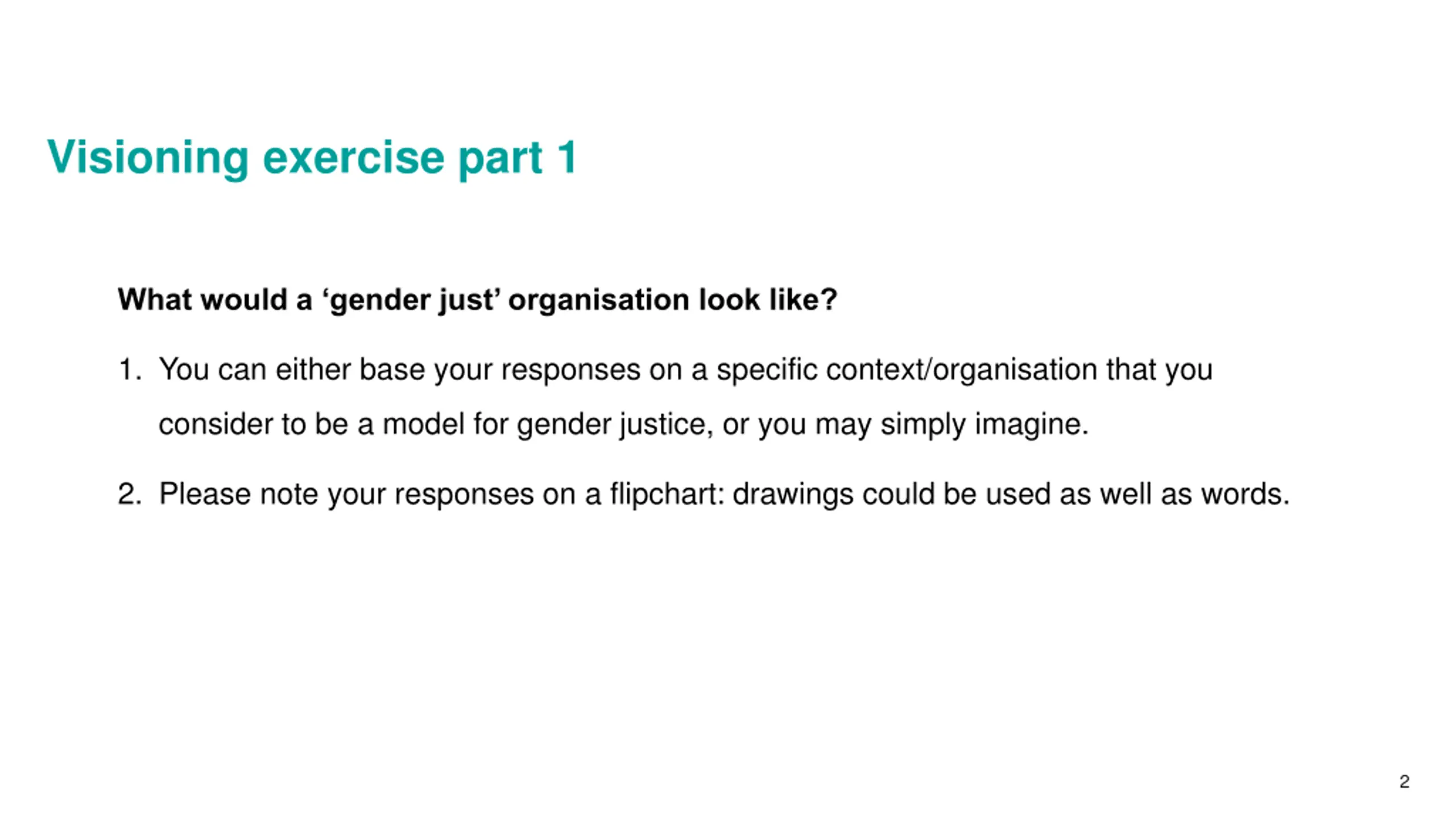 Visioning exercise part 1 What would a gender just organisation look like? 1. You can either base your responses on a specific context/organisation that you consider to be a model for gender justice, or you may simply imagine. 2. Please note your responses on a flipchart: drawings could be used as well as words. 2