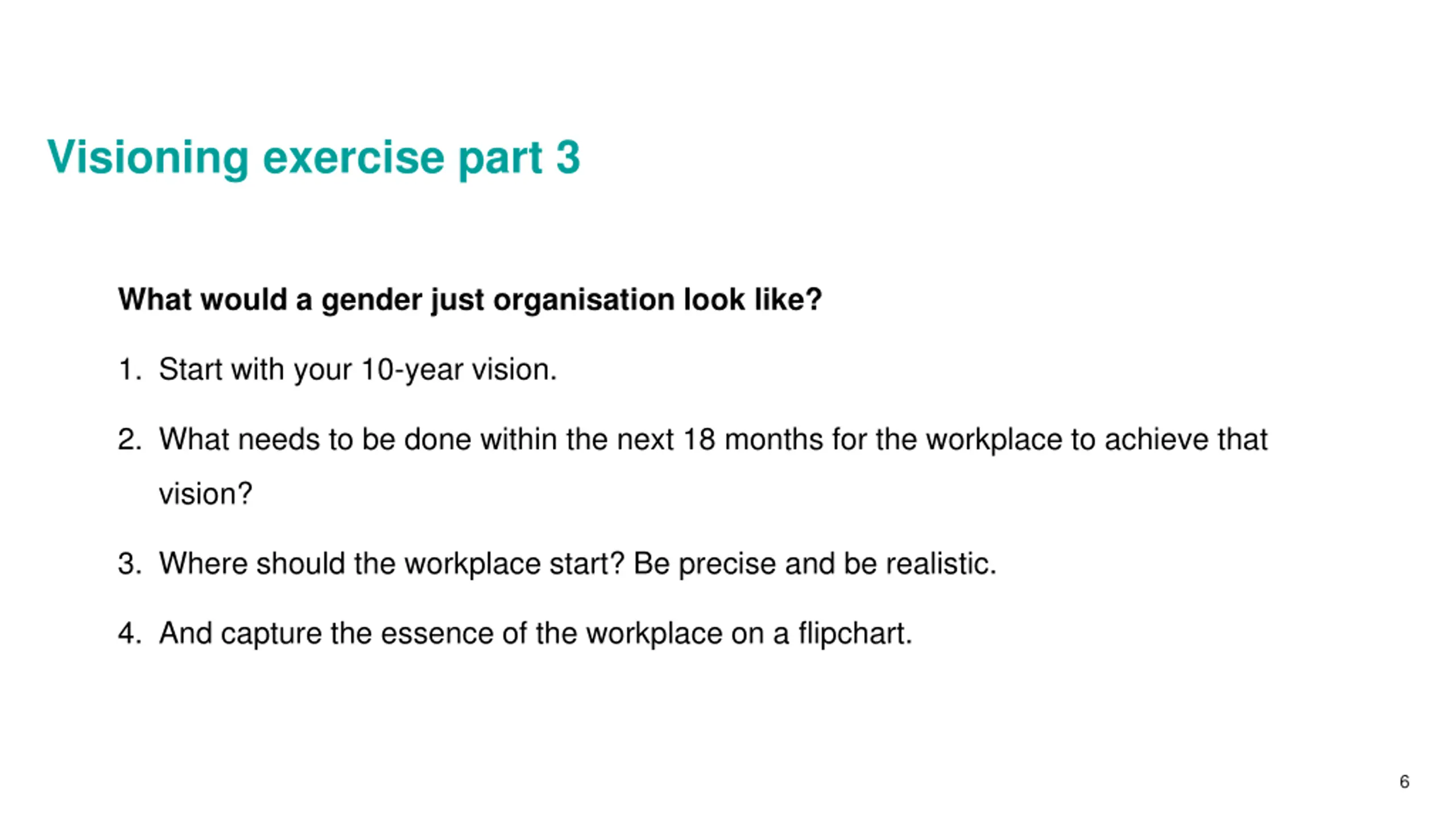Visioning exercise part 2 What would a gender just organisation look like? 1. Pick a workplace (ideally a workplace where one of you works). 2. Describe where the organisation might be in 10 years time with regard to gender justice. 3. How would the organisation look in terms of characteristics and practices? 4. Be ambitious, be creative, think big. 5. Capture the essence of the organisation on a flip chart and appoint a spokesperson to feed back. 5